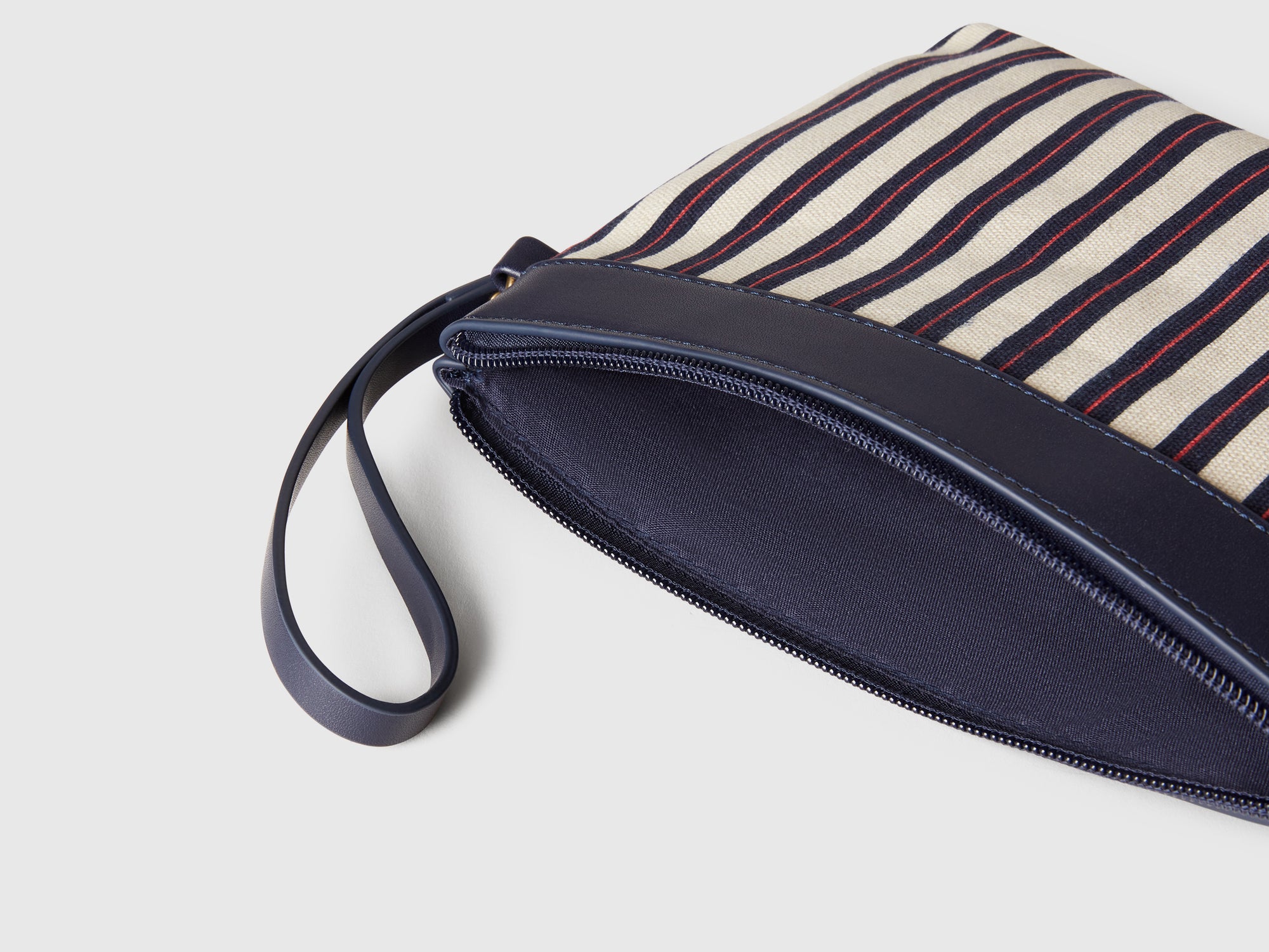 Cotton-blend canvas accessory pouch. Zipper closure with coated fabric zipper pull. Two-tone vertical striped pattern. Practical, functional, and cool.