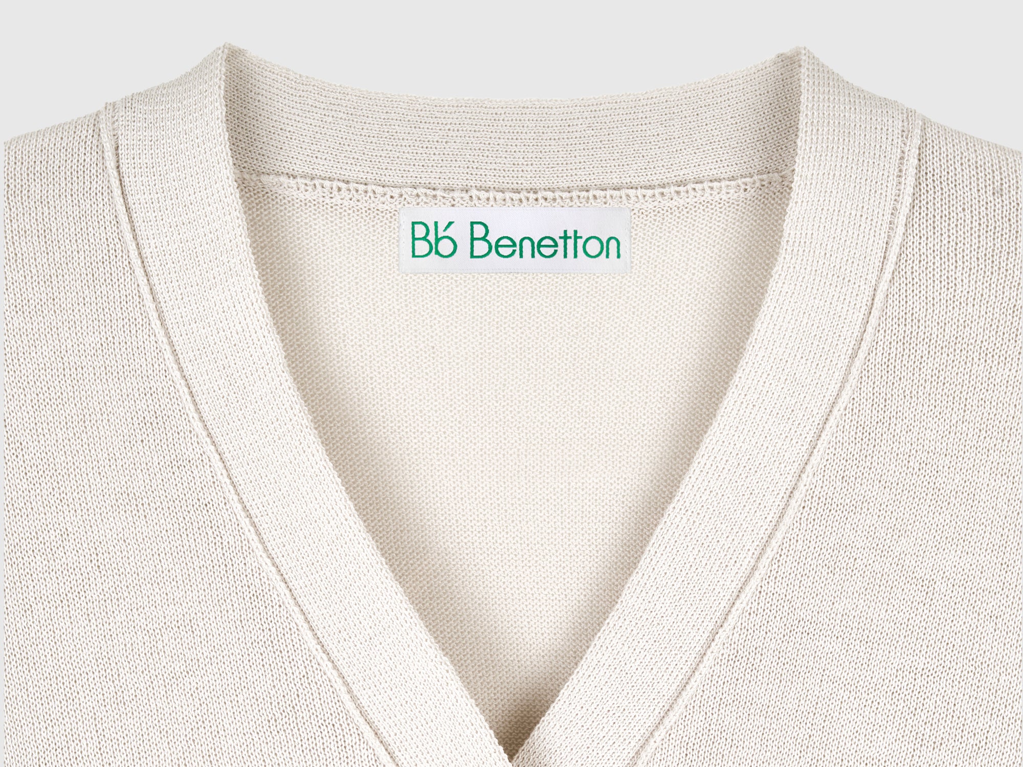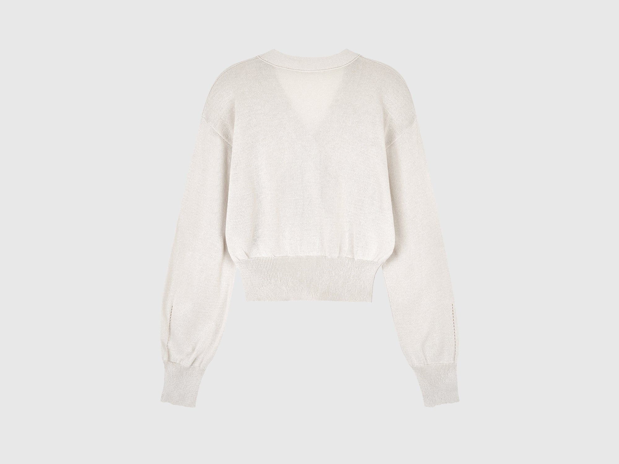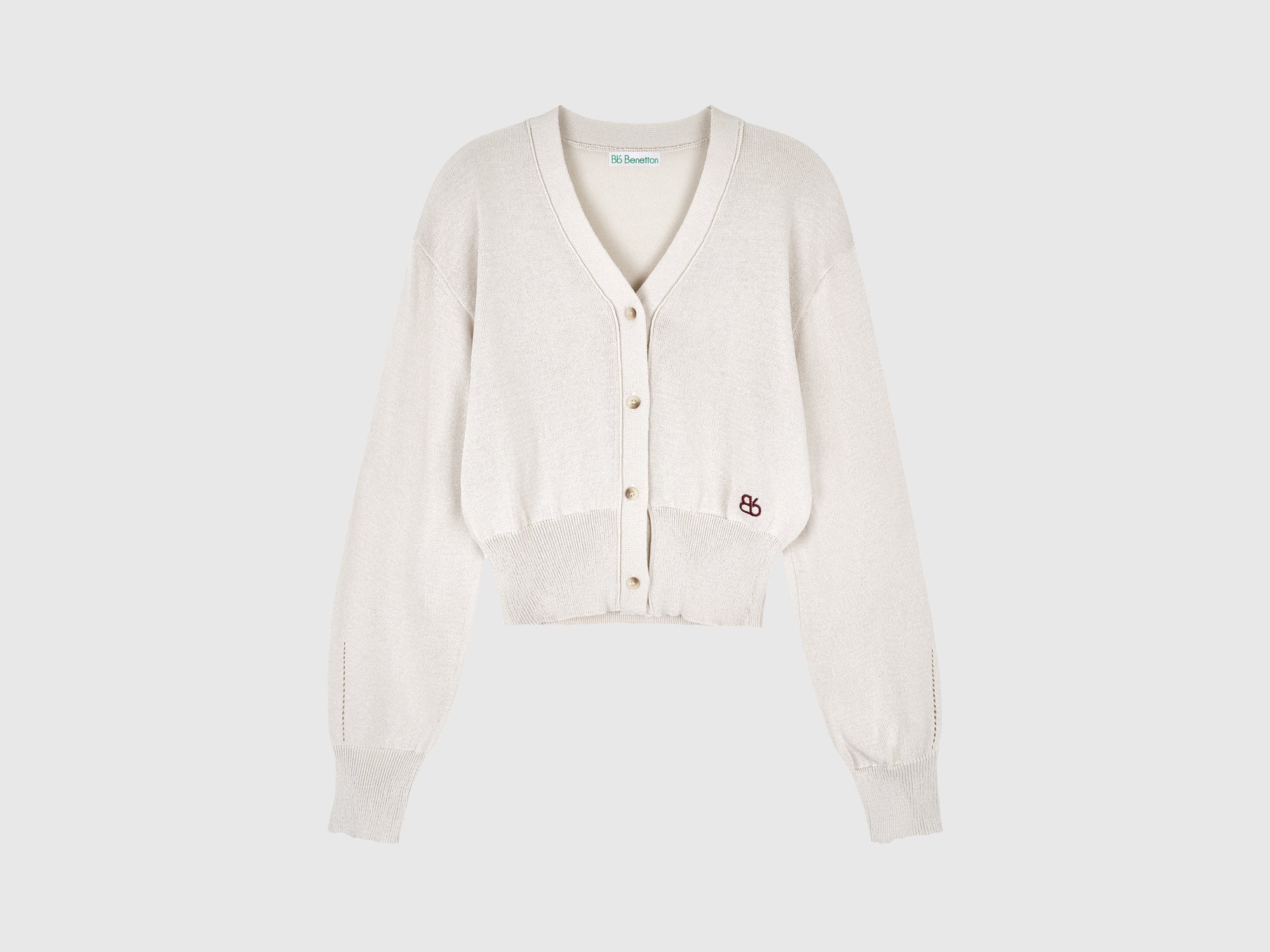 Long-sleeved cardigan in soft knit. V-neck, dropped shoulders, and front button placket. Contrasting logo at the left hem. Perfect for layering, comfortable against the skin.