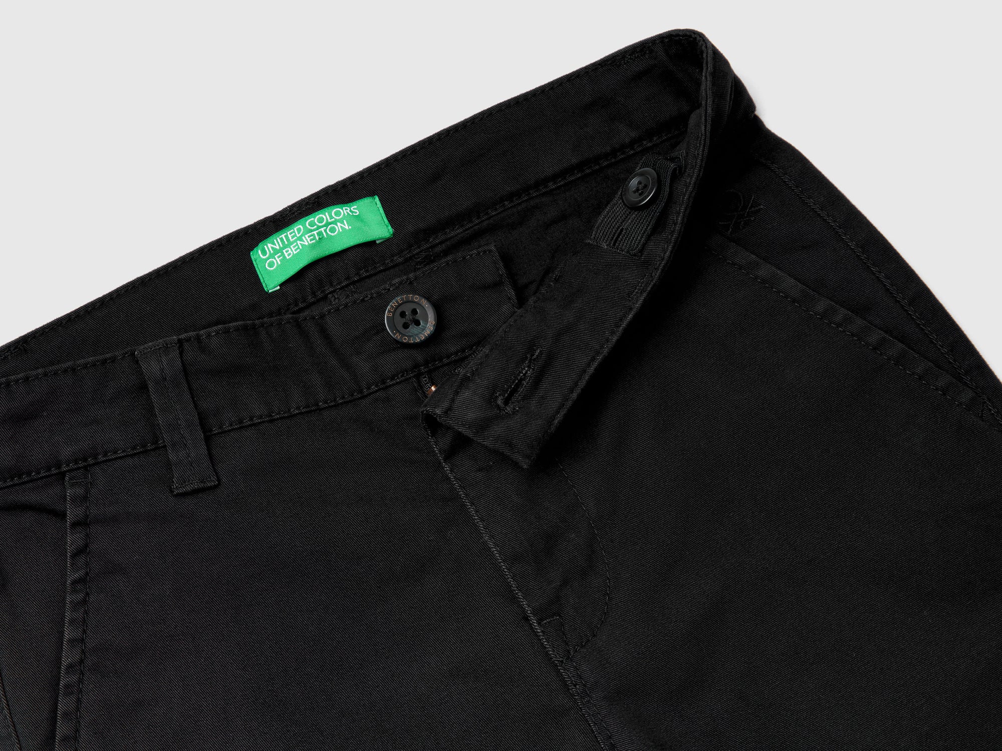 - Main features: Brushed stretch cotton gabardine; Waistband with belt loops and adjustable internal elastic; Nickel-free metal hardware