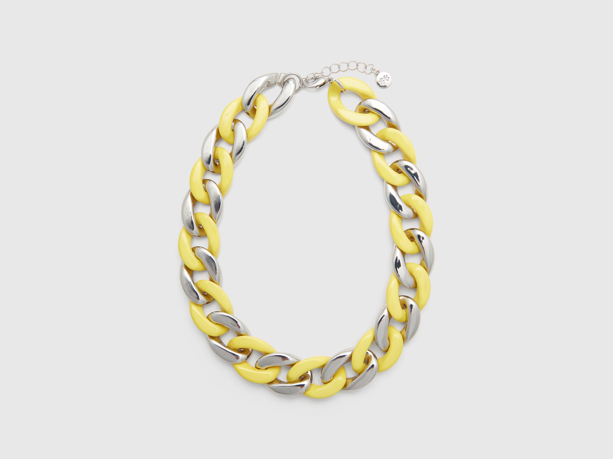 Lightweight metal chain necklace with a silver finish. Yellow enamel links and an adjustable hook closure. A glamorous and colorful piece of jewelry, perfect for adding a personal touch to any outfit. Zinc, iron, and resin; Nickel-free