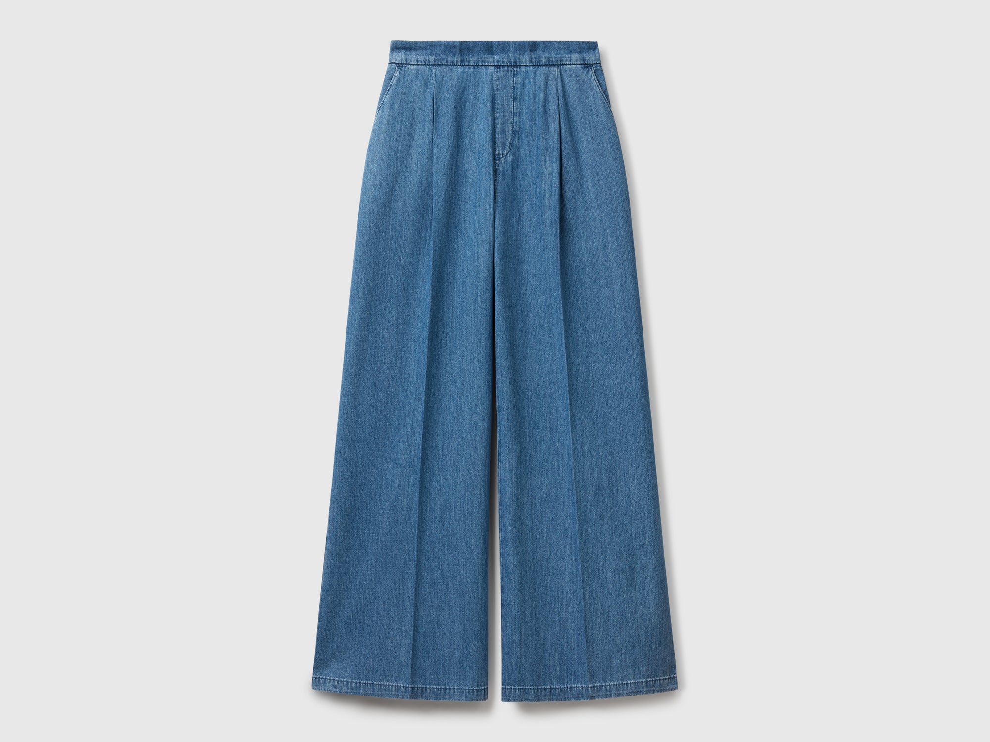 Long denim trousers in a cotton and hemp blend. Relaxed leg, elasticated waistband at the back, and front pockets. Vintage-inspired design that never goes out of style. Loose fit: we recommend choosing one size smaller than your usual size.