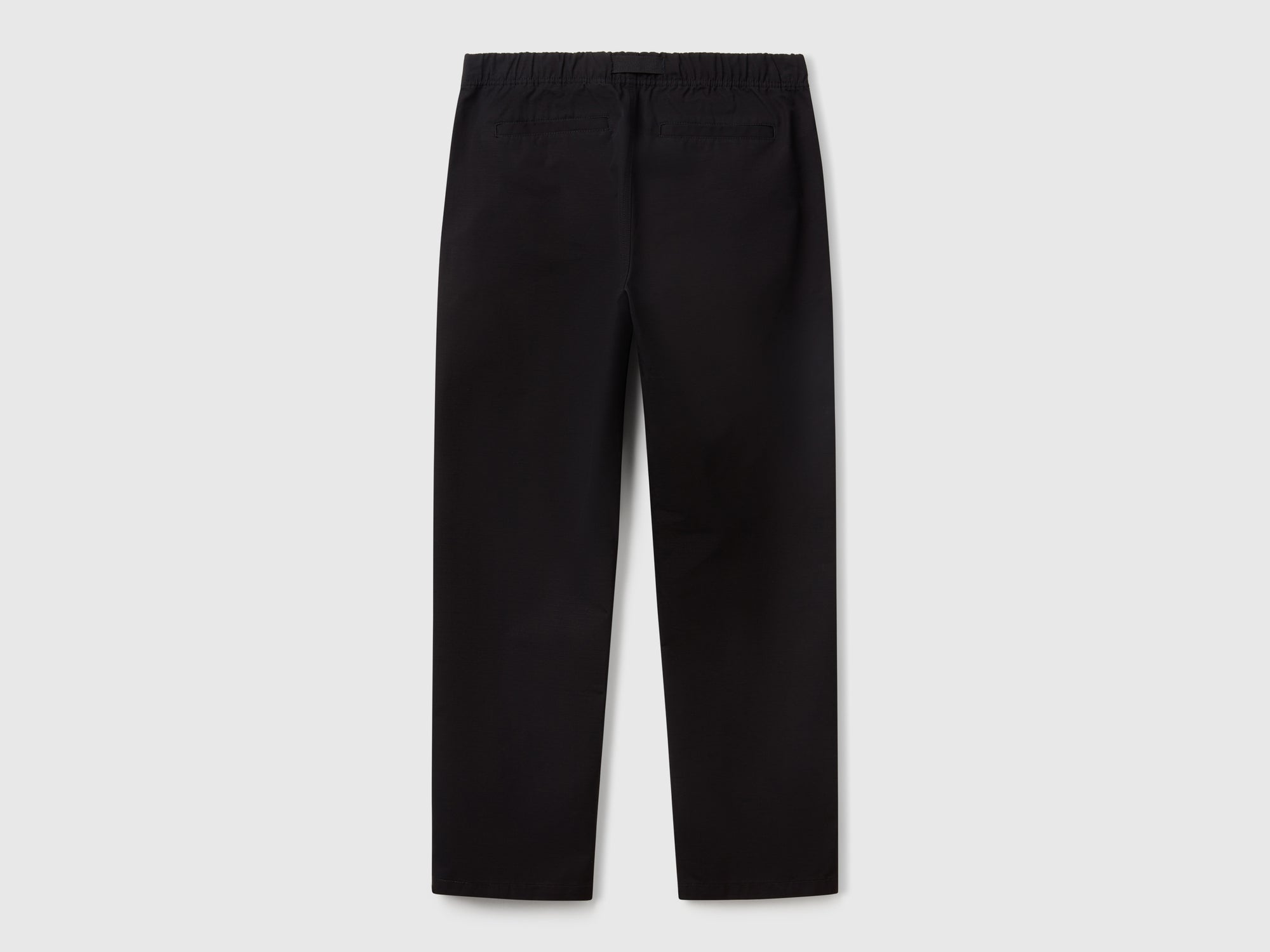 Pantaloni lunghi in morbido tessuto di puro cotone. Apertura a zip e bottone, elastico interno sul retro e sui fianchi regolabile con fibbia sul davanti. Tasche inserite nei fianchi e taschini a filetto sul retro. Gamba dritta e morbida, per casual look quotidiani.
