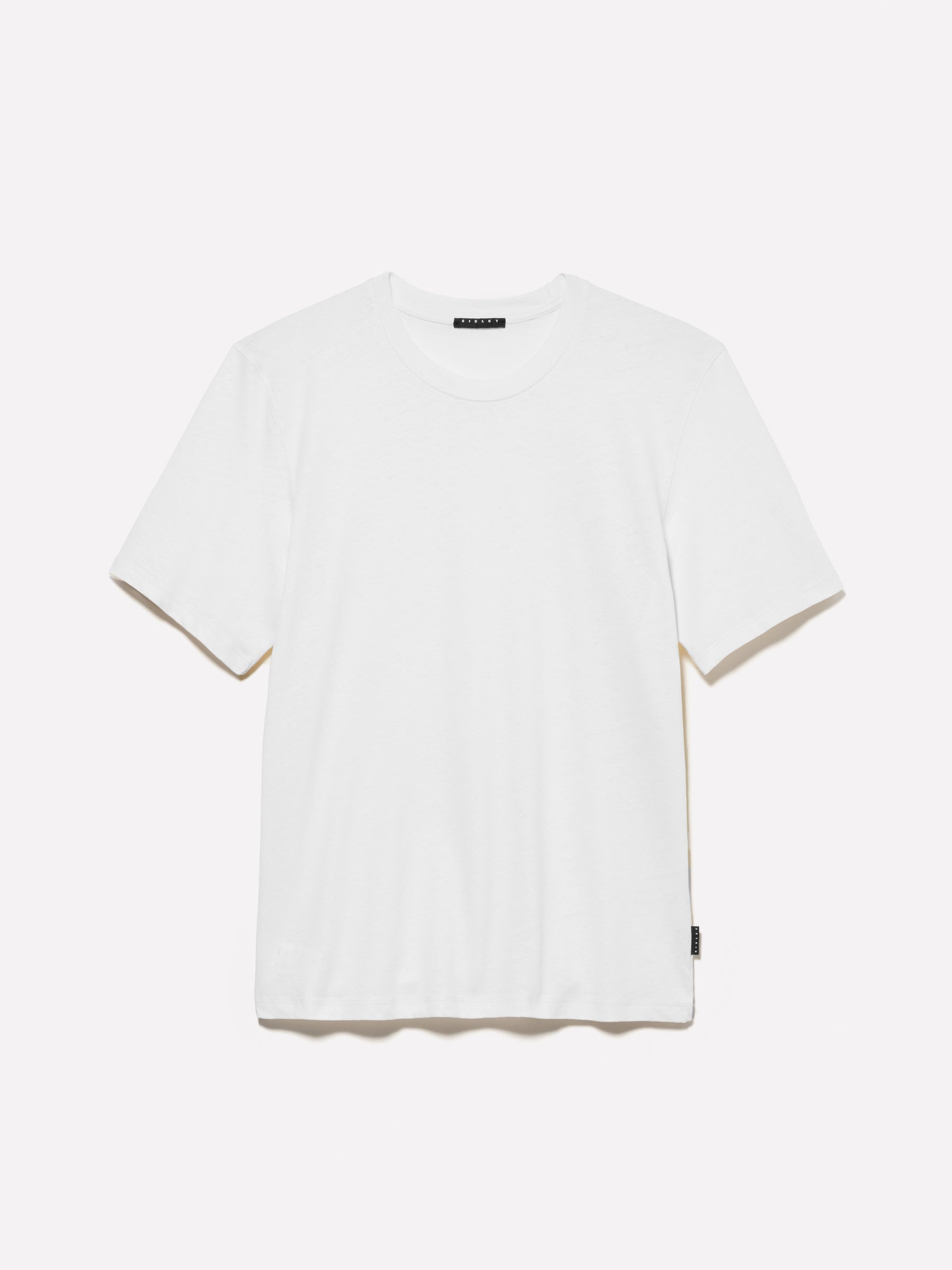 Off-white cotton and linen blend T-shirt. Crew neck and short sleeves with slightly dropped shoulders.
