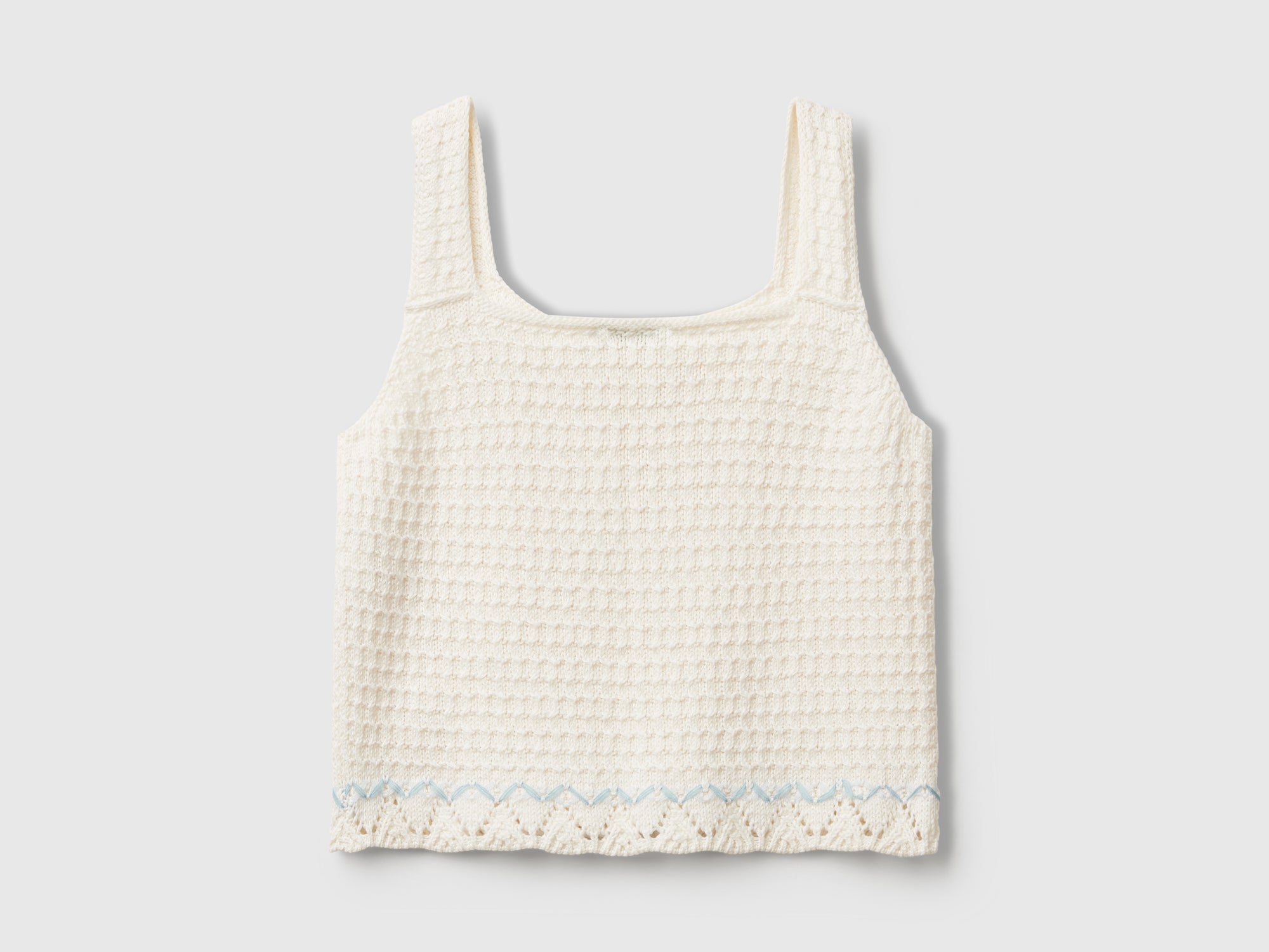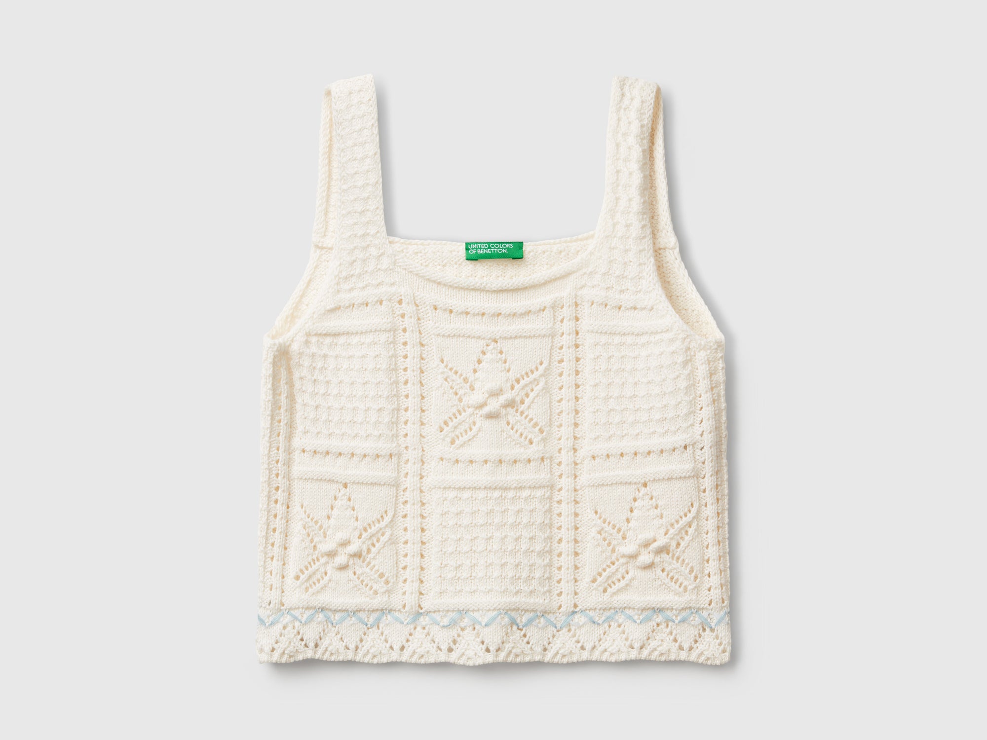 Top smanicato in morbida maglia di misto cotone riciclato. Spalline larghe e scollo dritto. Particolare lavorazione con gioco di punti effetto crochet e stelle traforate. Articolo realizzato con filato contenente almeno il 20% di cotone riciclato.