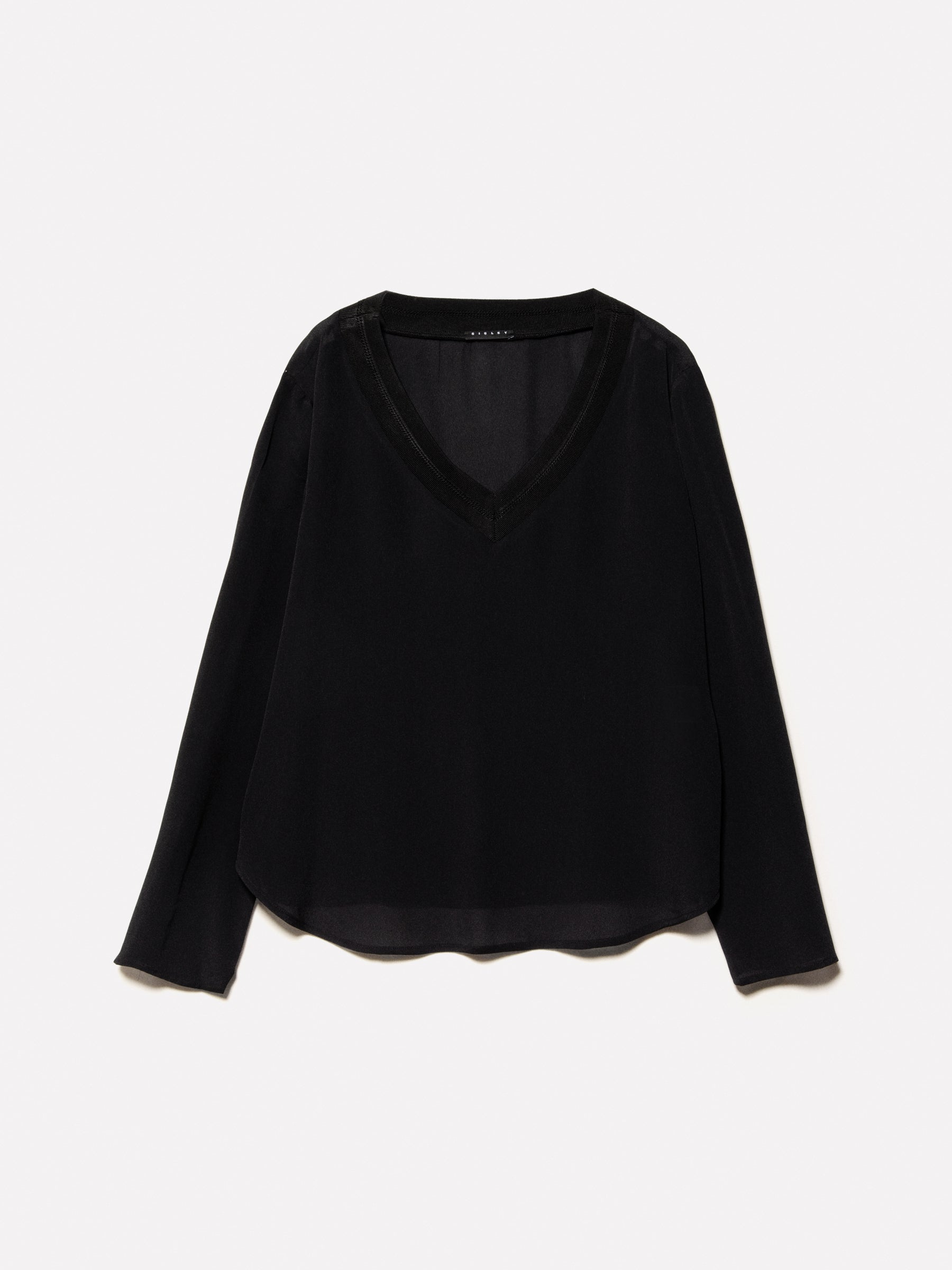 Blusa nera in crêpe leggero 100% viscosa. Scollo a V in maglia a costine con riga a contrasto, maniche lunghe e spalla morbida.