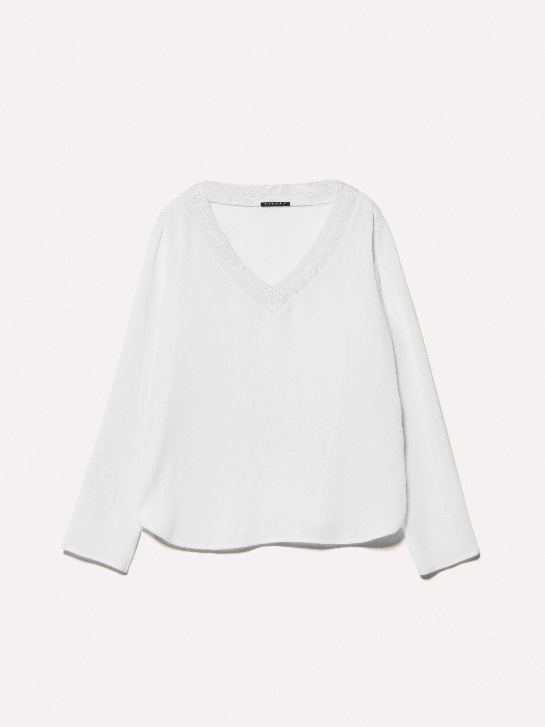 Blusa bianco panna in crêpe leggero 100% viscosa. Scollo a V in maglia a costine con riga a contrasto, maniche lunghe e spalla morbida.