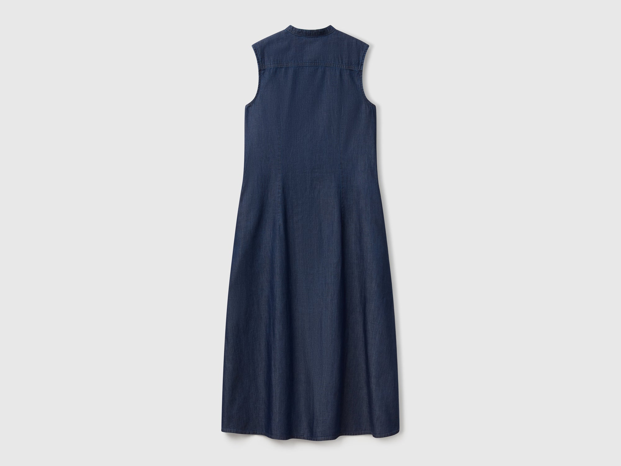 Vestito lungo modello chemisier in chambray di puro cotone con spacchi sul fondo. Collo alla coreana, apertura frontale con bottoni a pressione e taschini applicati sul petto. Taglio aggiornato, ideale per look quotidiani.