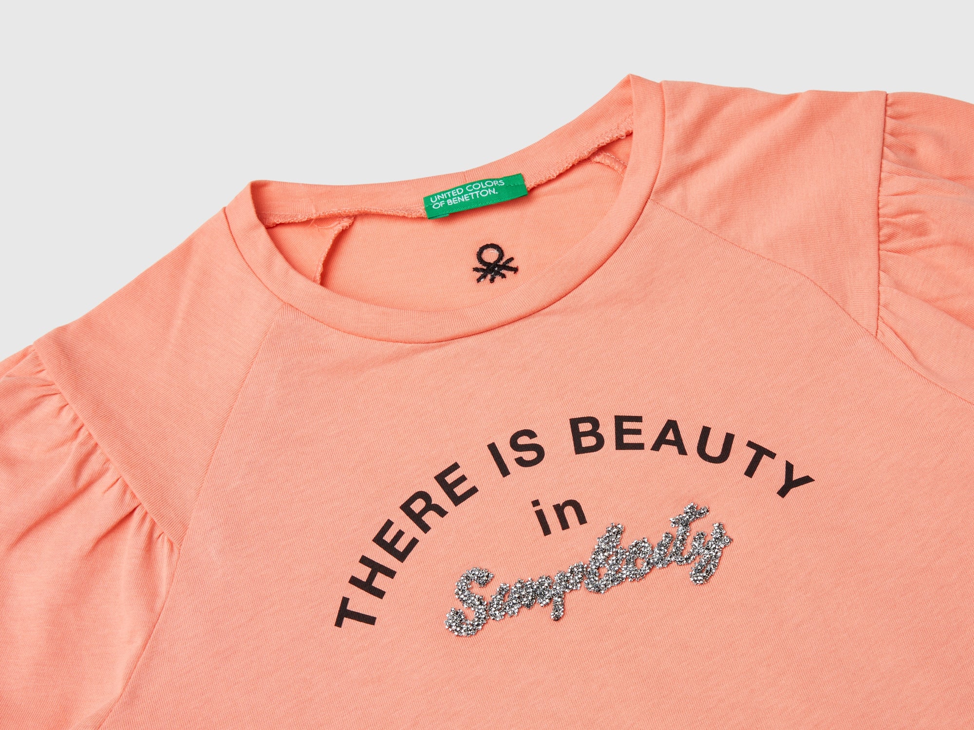 Maglietta girocollo in morbido tessuto di puro cotone biologico. Vestibilità comoda con manica corta, stampa slogan e applicazione sul davanti. Romantica e femminile. Articolo realizzato con materiale contenente almeno il 95% di cotone biologico.