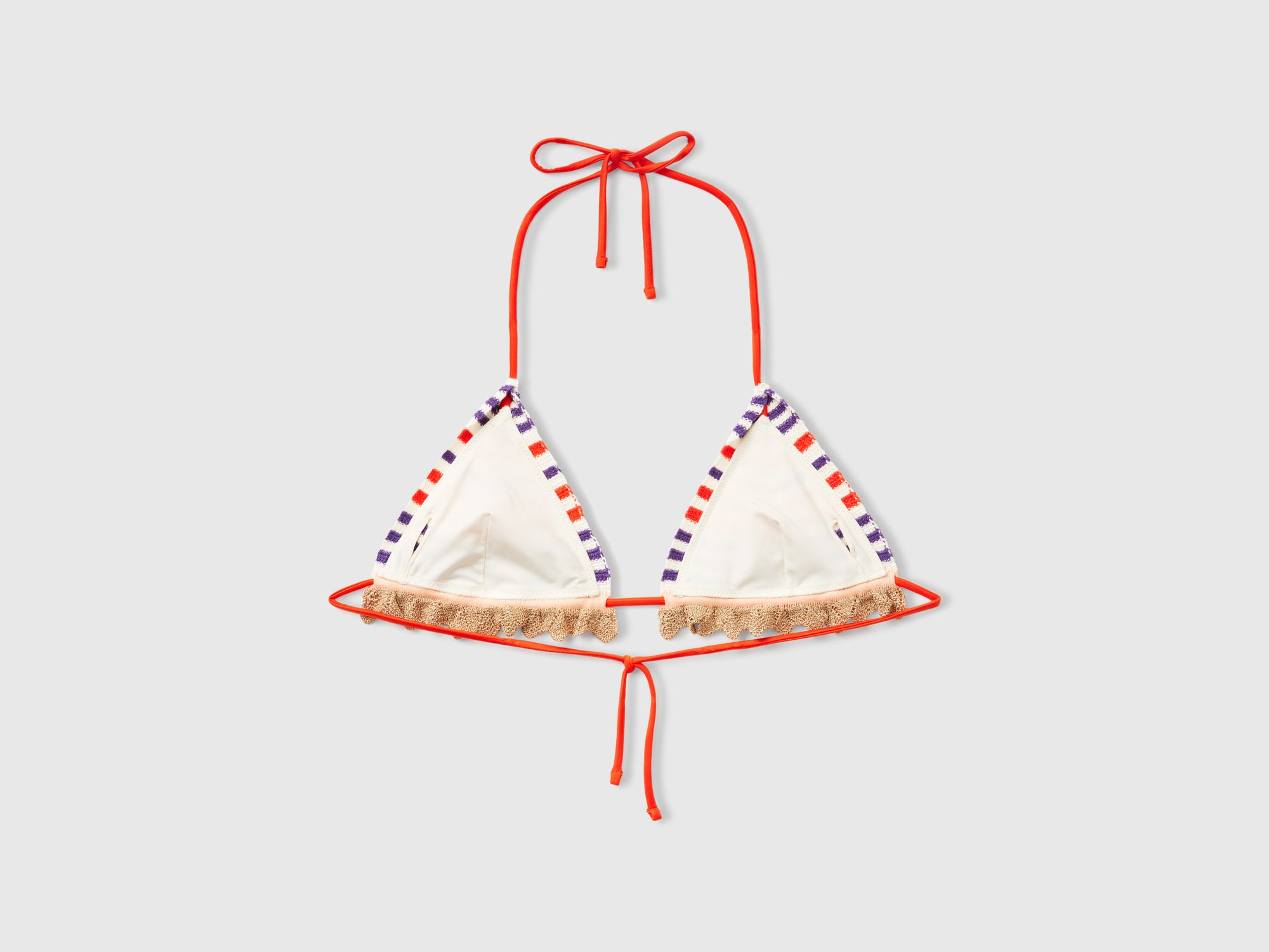 Reggiseno costume a triangolo in morbido pizzo di misto cotone con lurex e fantasia a righe. Coppa B scorrevole con rouches, lacci da annodare al collo e sulla schiena.