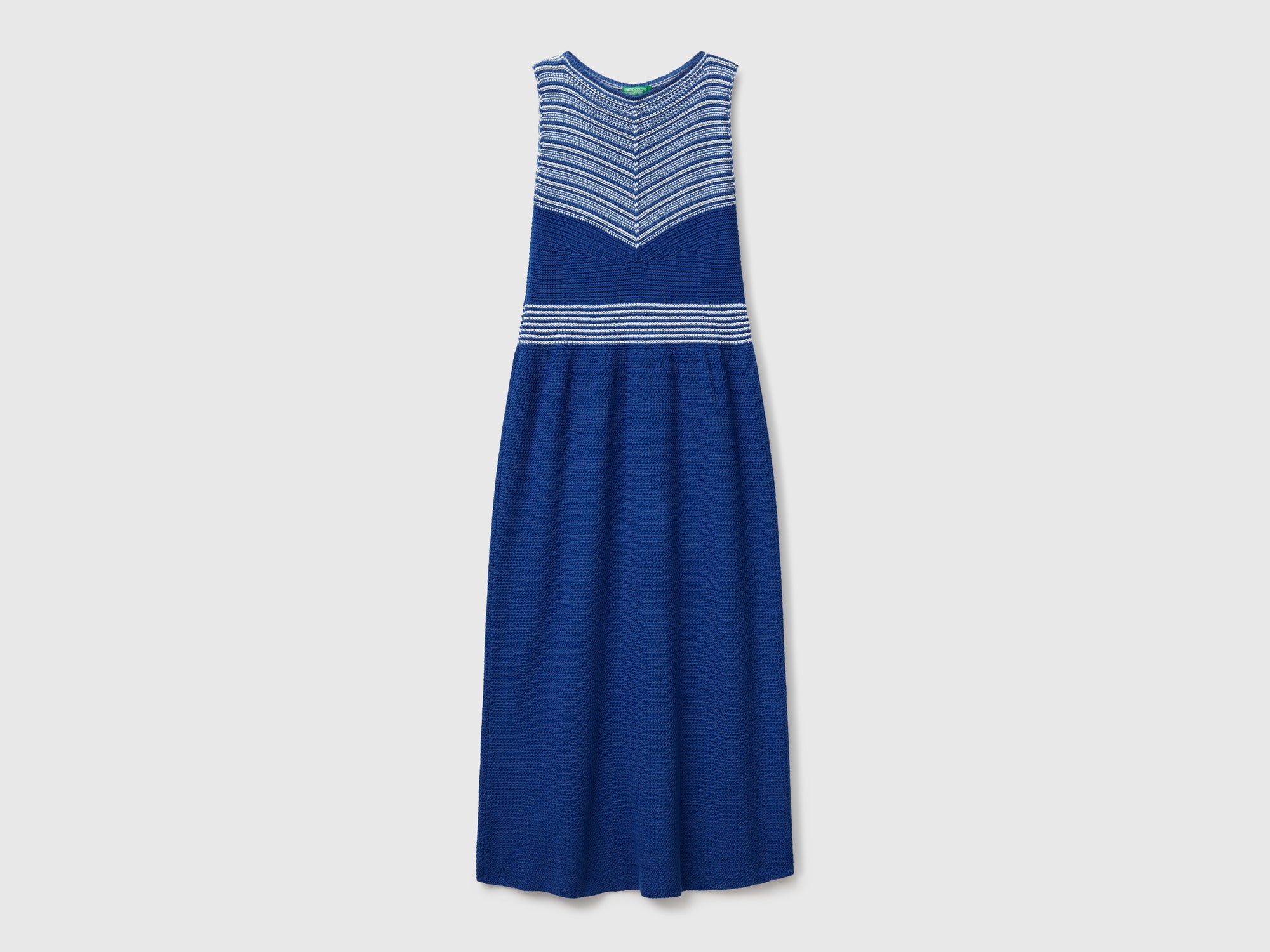 Abito lungo in morbida maglia di puro cotone con lavorazione in punto crochet. Scollo all'americana con motivo a righe multicolor sul busto e gonna dalla vestibilità morbida. Per look cool e leggeri, dal gusto romantico.