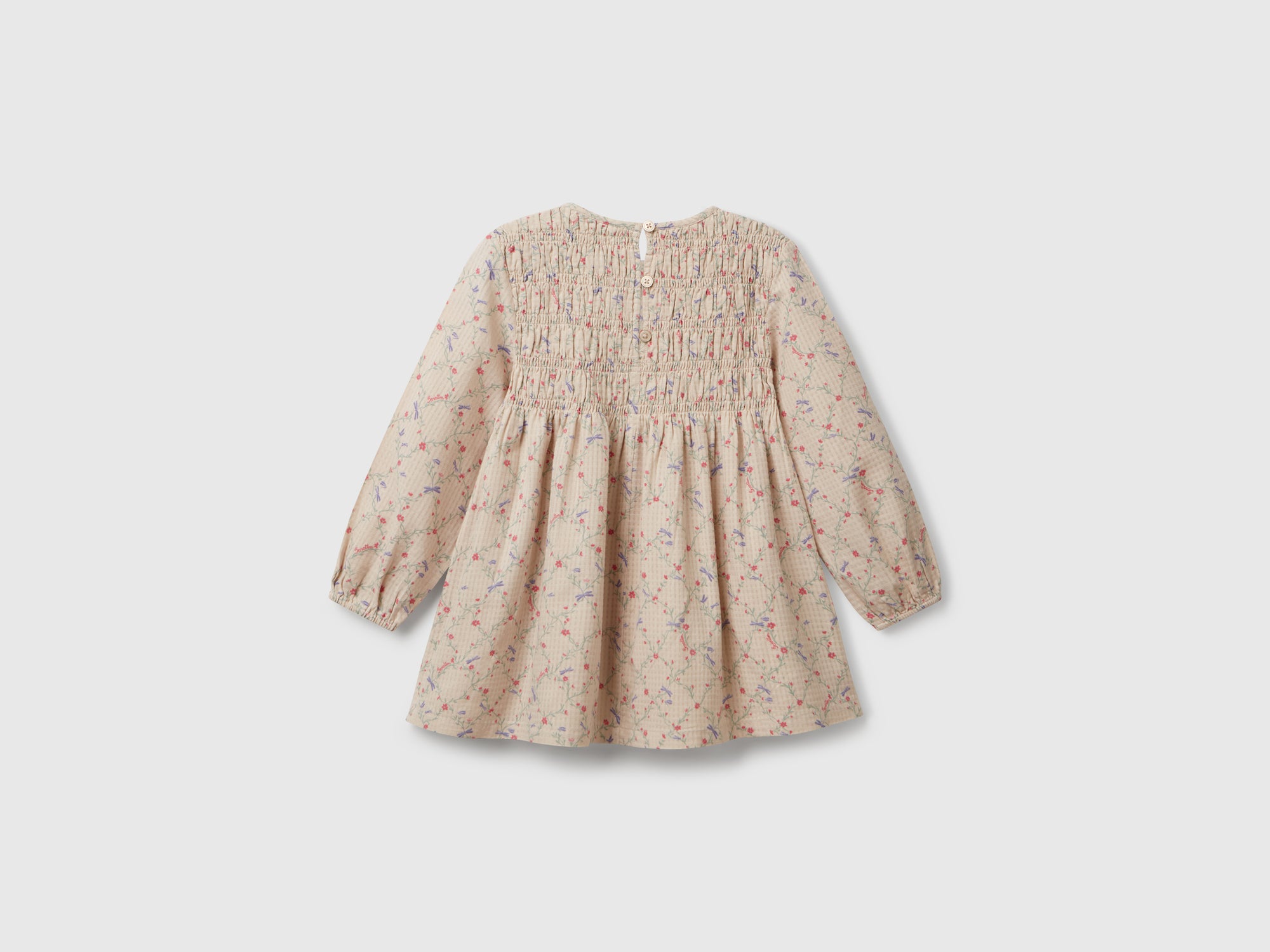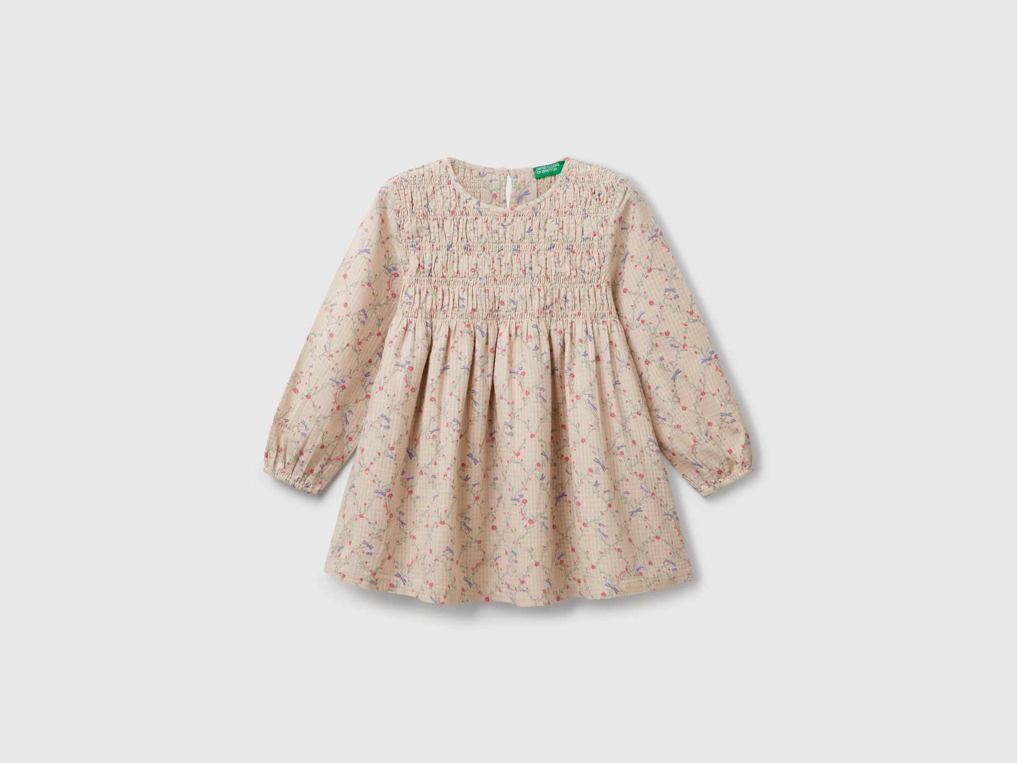 Vestito girocollo foderato in tessuto leggero di puro cotone. Manica lunga con elastico sui polsi, apertura a goccia con bottoncino sul retro. Romantica stampa fiori su tutto il capo, per look femminili e raffinati.