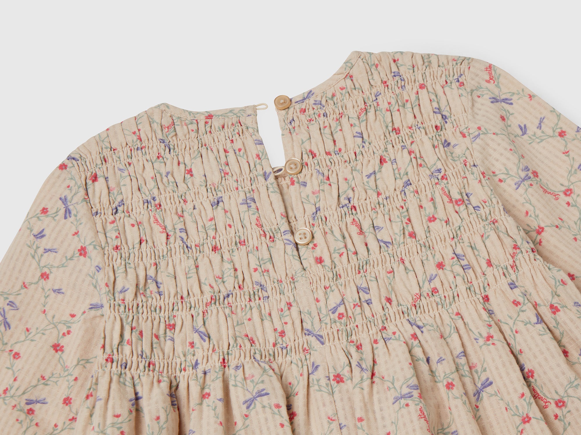 - Main features: Tessuto seersucker di 100% cotone; Fodera: 100% cotone; Stampa all over; Ricamo cucito su una base di arricciature sul petto