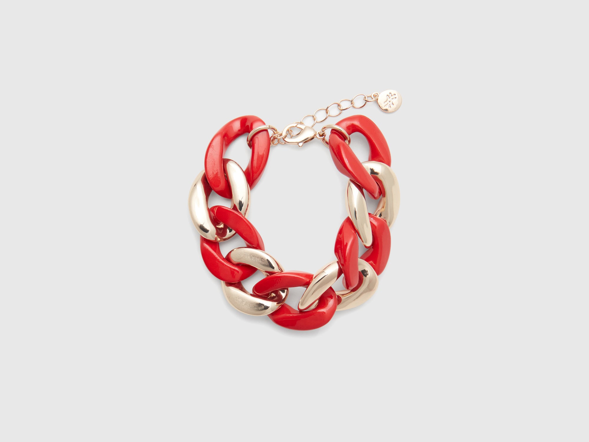 Bracciale a catena in metallo con finitura dorata. Anelli smaltati color mattone, chiusura con gancetto regolabile. Un bijoux glamour e colorato, perfetto per aggiungere un tocco personale ad ogni outfit.