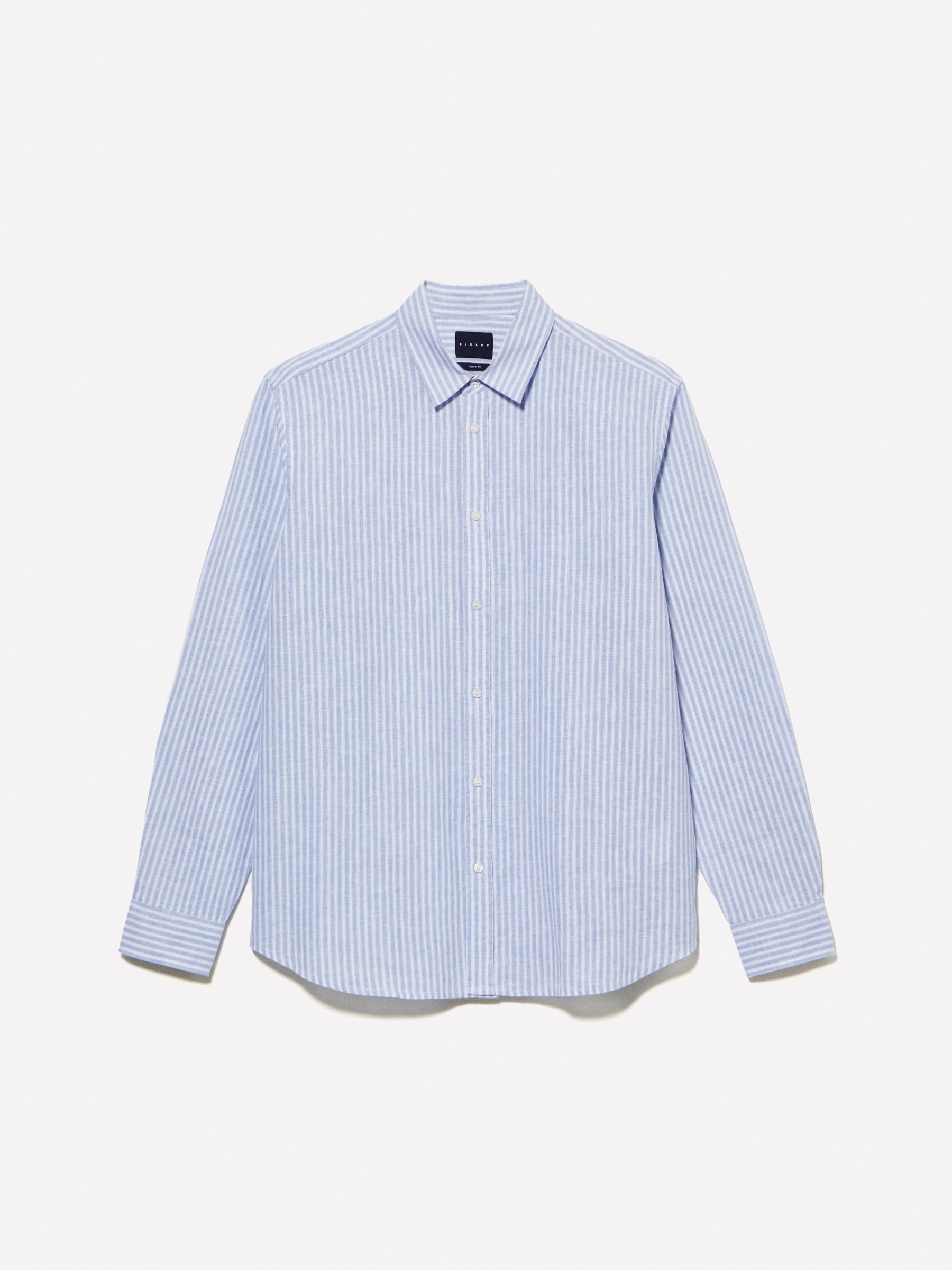 Camicia azzurra a righe regular fit in misto cotone e lino. Colletto, abbottonatura frontale, maniche lunghe con spalla morbida e fondo stondato. Articolo realizzato con materiale contenente almeno il 50% di lino coltivato in Europa.