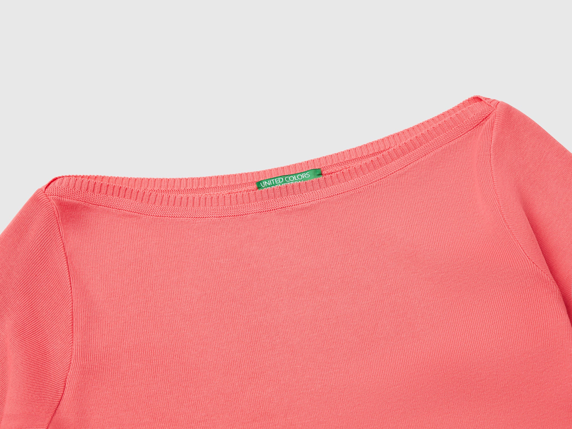 Maglione primaverile in puro cotone a costine con scollo a barchetta e manica a 3/4. Semplice, femminile e versatile.