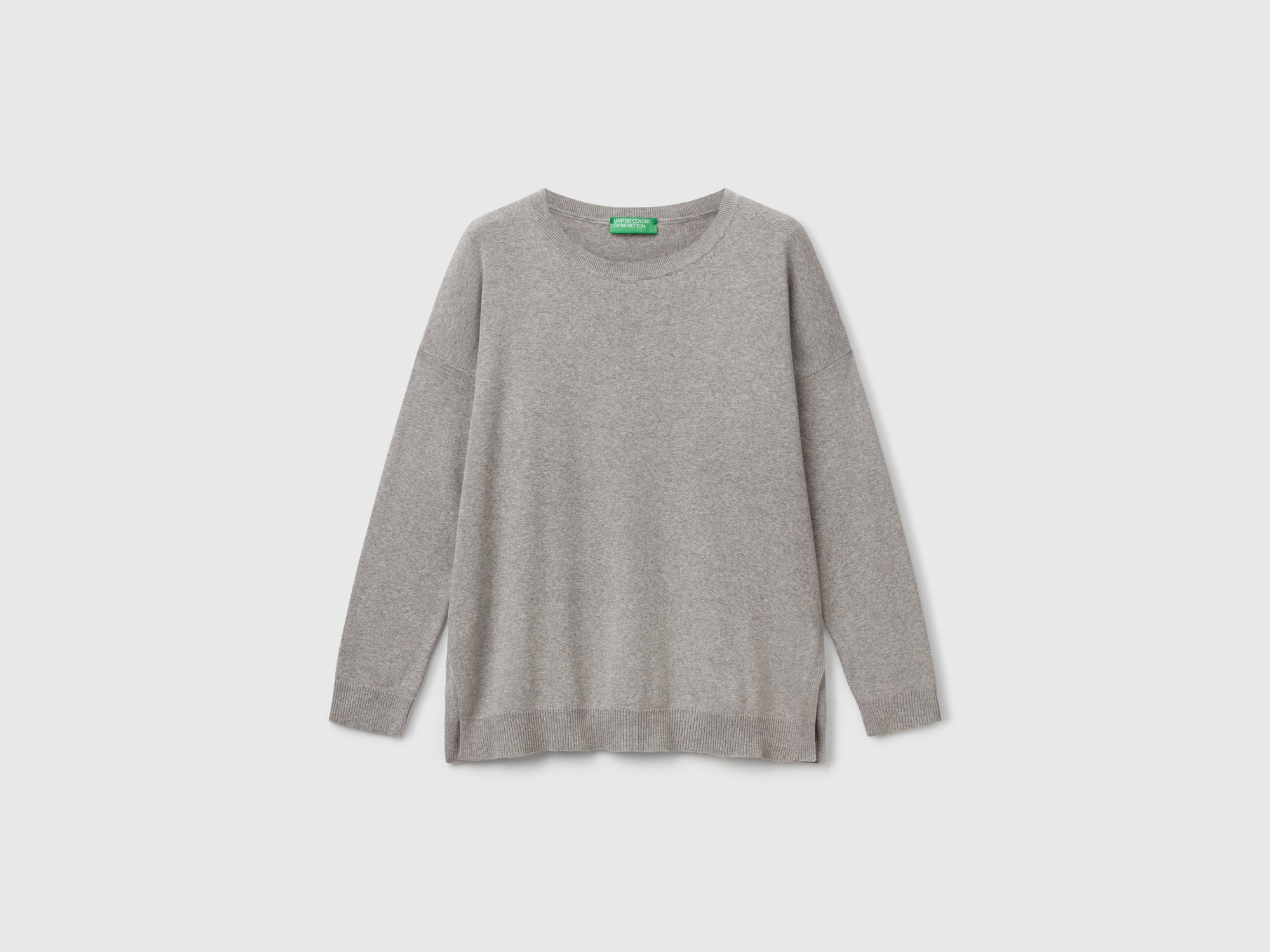 - Main features: Long-sleeved, loose-fitting sweater in pure cotton. Round neck, dropped shoulders, and side slits. Slightly longer at the back. Casual and comfortable. 100% cotton; Plain knit; Ribbed edges