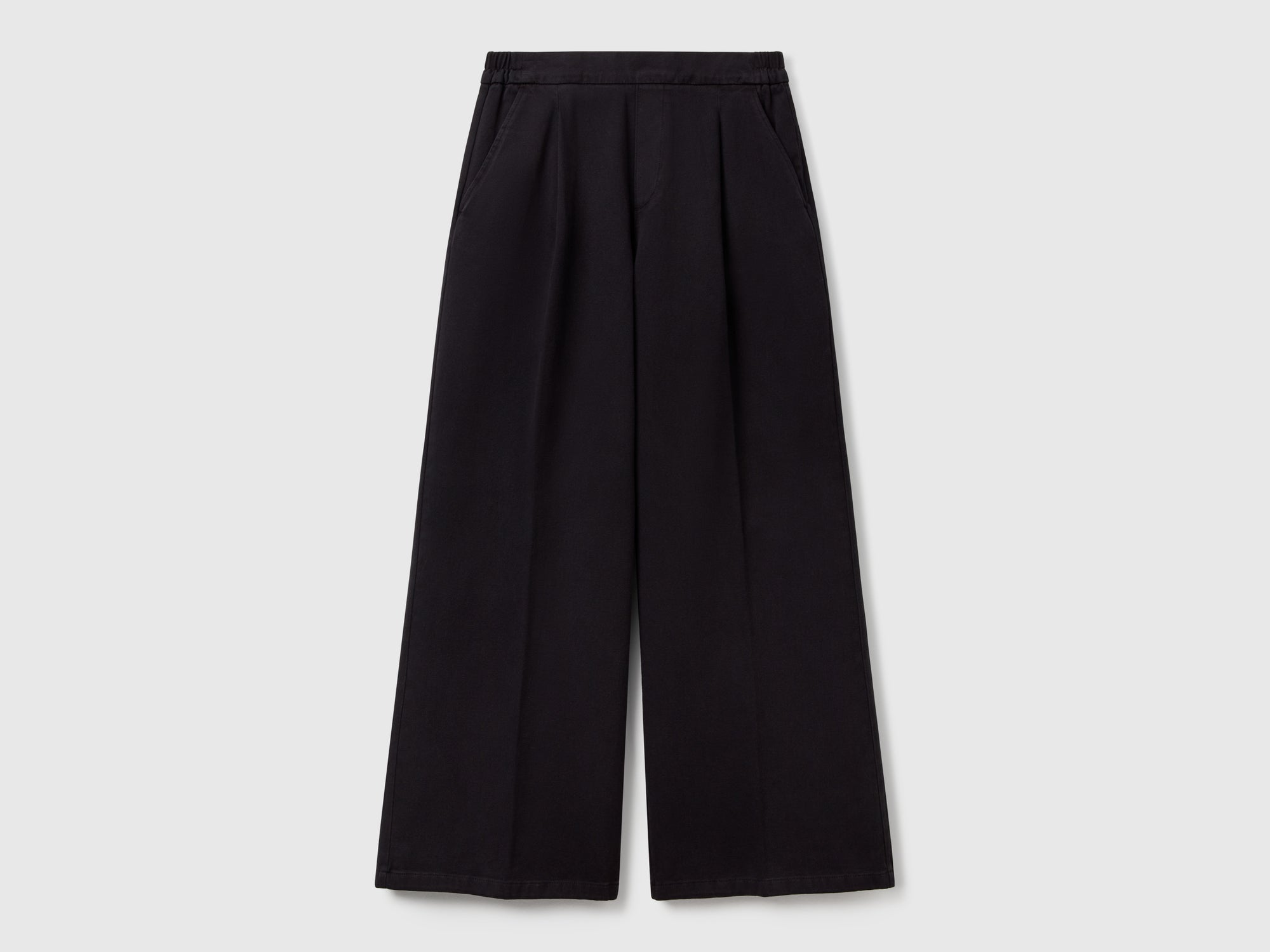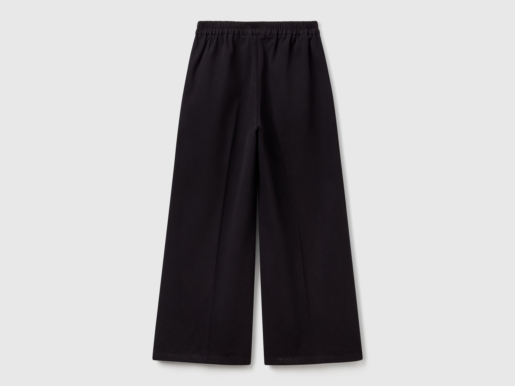 Pantaloni lunghi in puro cotone tinto capo. Modello a palazzo con gamba ampia e morbida. Vita alta con elastico interno sul retro, tasche inserite sui fianchi. Perfetti per casual look cittadini. Vestibilità ampia: si consiglia di scegliere una taglia in meno rispetto alla misura abituale.