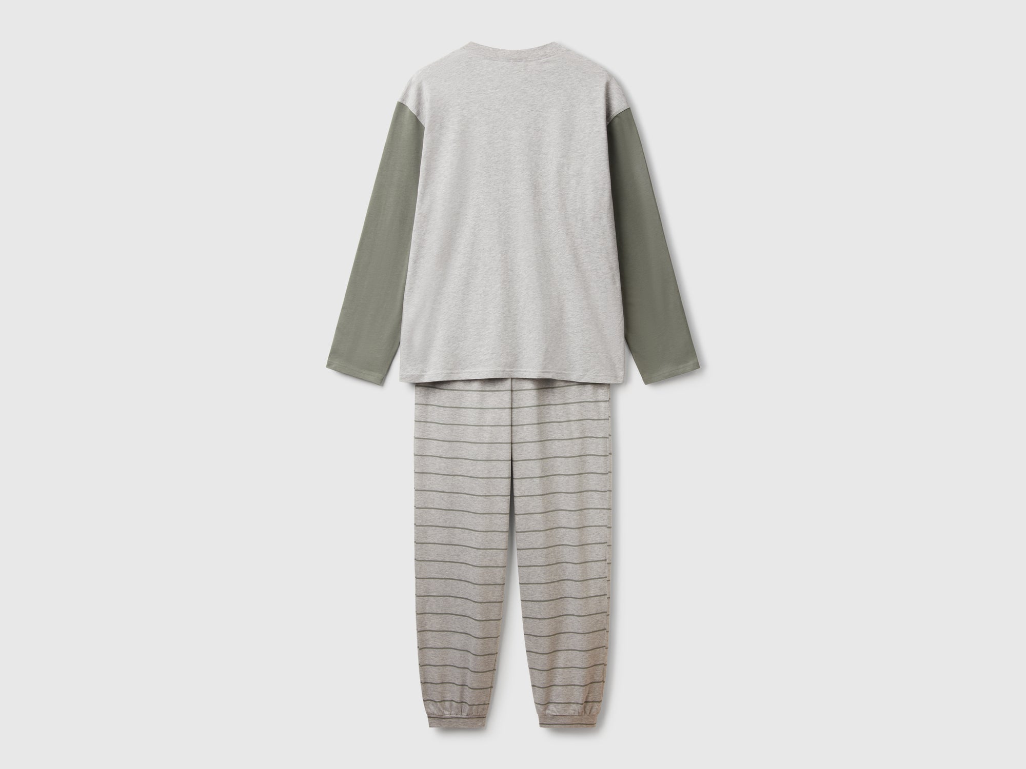 Pigiama lungo in morbido tessuto di puro cotone. Maglia girocollo con manica lunga a contrasto. Pantaloni con fantasia a righe ed elastico interno in vita.