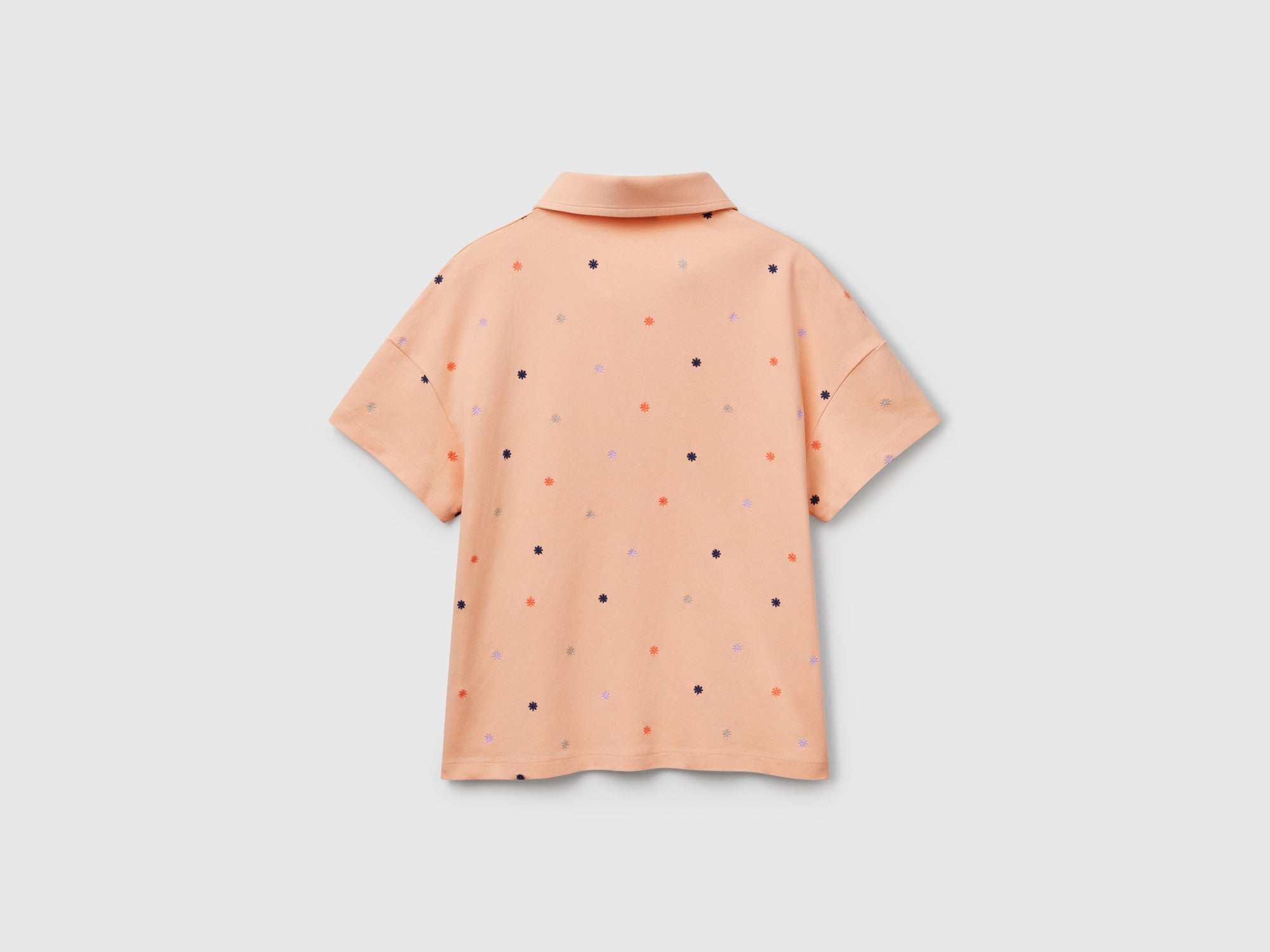 Polo a manica corta in morbido tessuto di puro cotone. Vestibilità regolare con colletto classico e scollo a V. Fiori ricamati su tutto il capo, per outfit romantici e femminili.