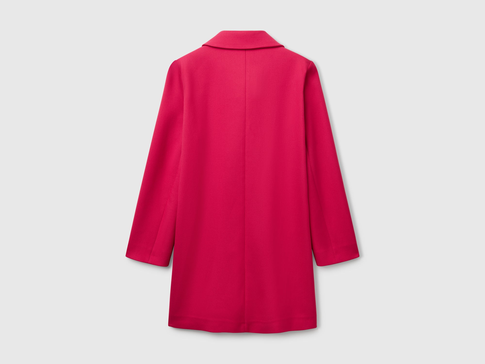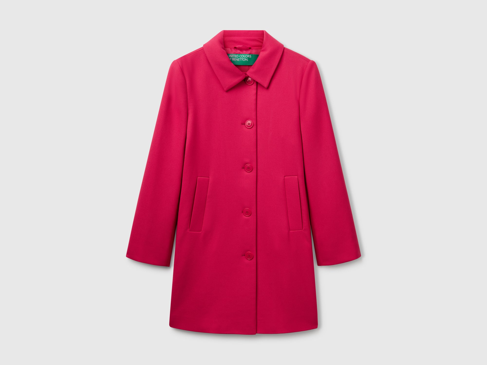 Cappotto realizzato in misto viscosa elasticizzata, foderato in misto viscosa. Taglio svasato, collo a camicia e abbottonatura frontale. Lunghezza a metà coscia, taschini a filetto sul davanti. Semplice ma elegante, adatto anche per le occasioni formali.