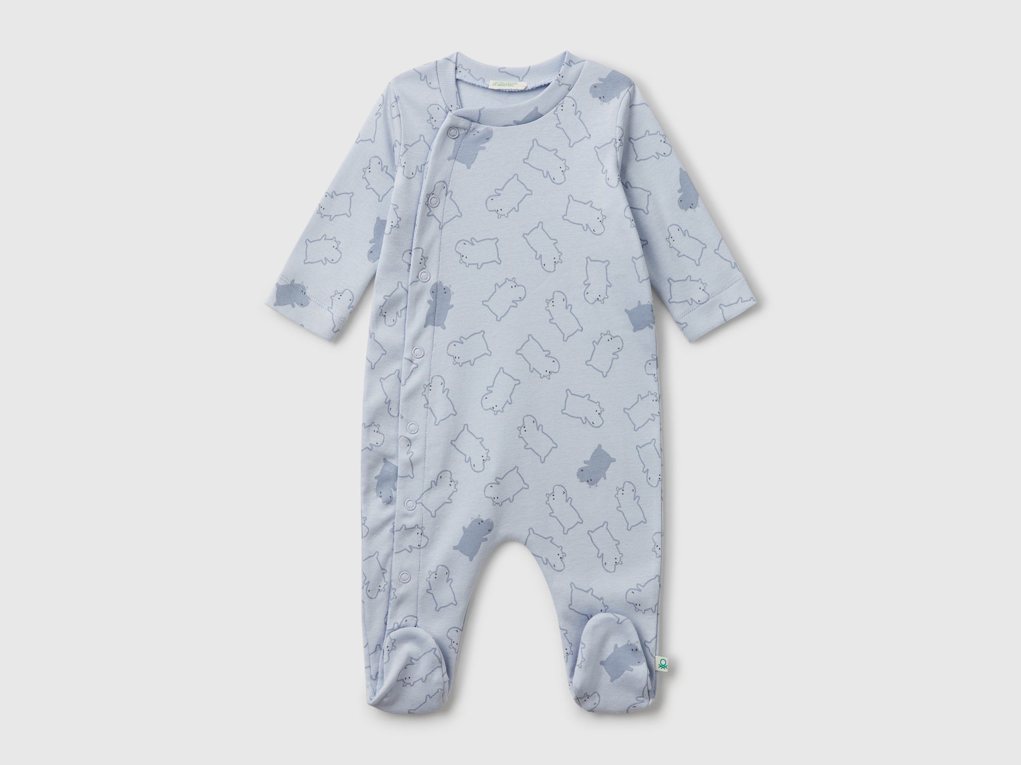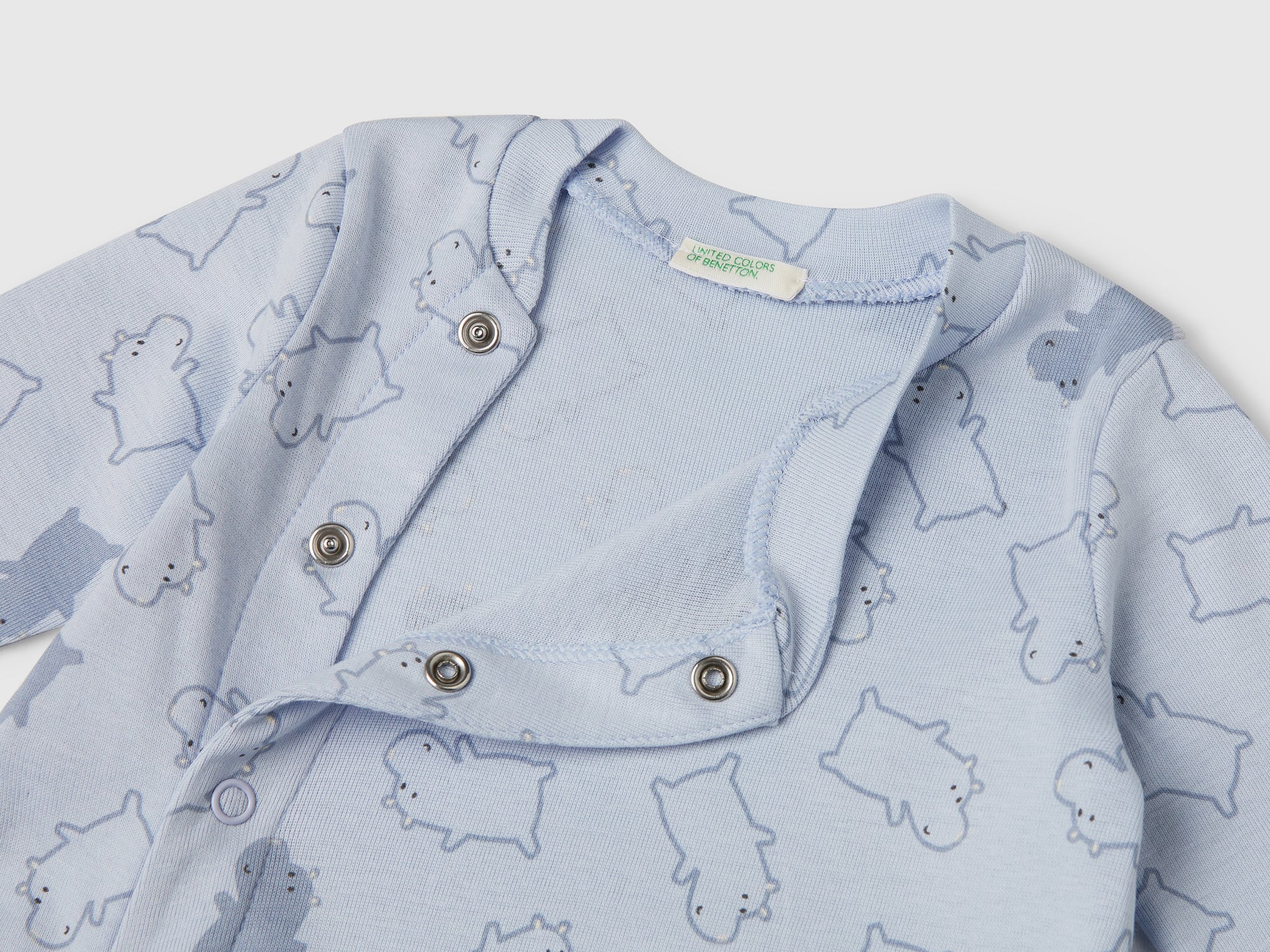 Tutina a manica lunga in morbido tessuto di cotone biologico a costine. Scollo rotondo, apertura con bottoni a pressione sul davanti, fondo gamba con piedini. Tenera stampa fantasia sul davanti. Articolo realizzato con materiale contenente almeno il 95% di cotone biologico.