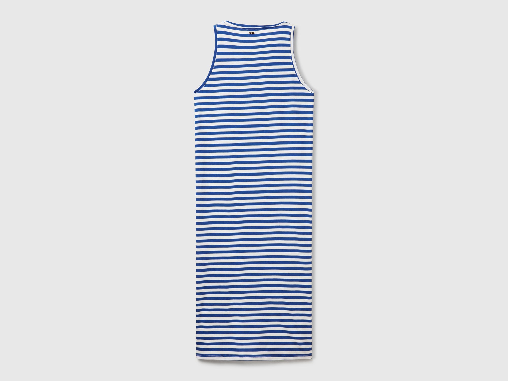 Abito midi copricostume in morbido tessuto di puro cotone. Fantasia a righe tinto filo, scollo rotondo e ampio spacco sul davanti.