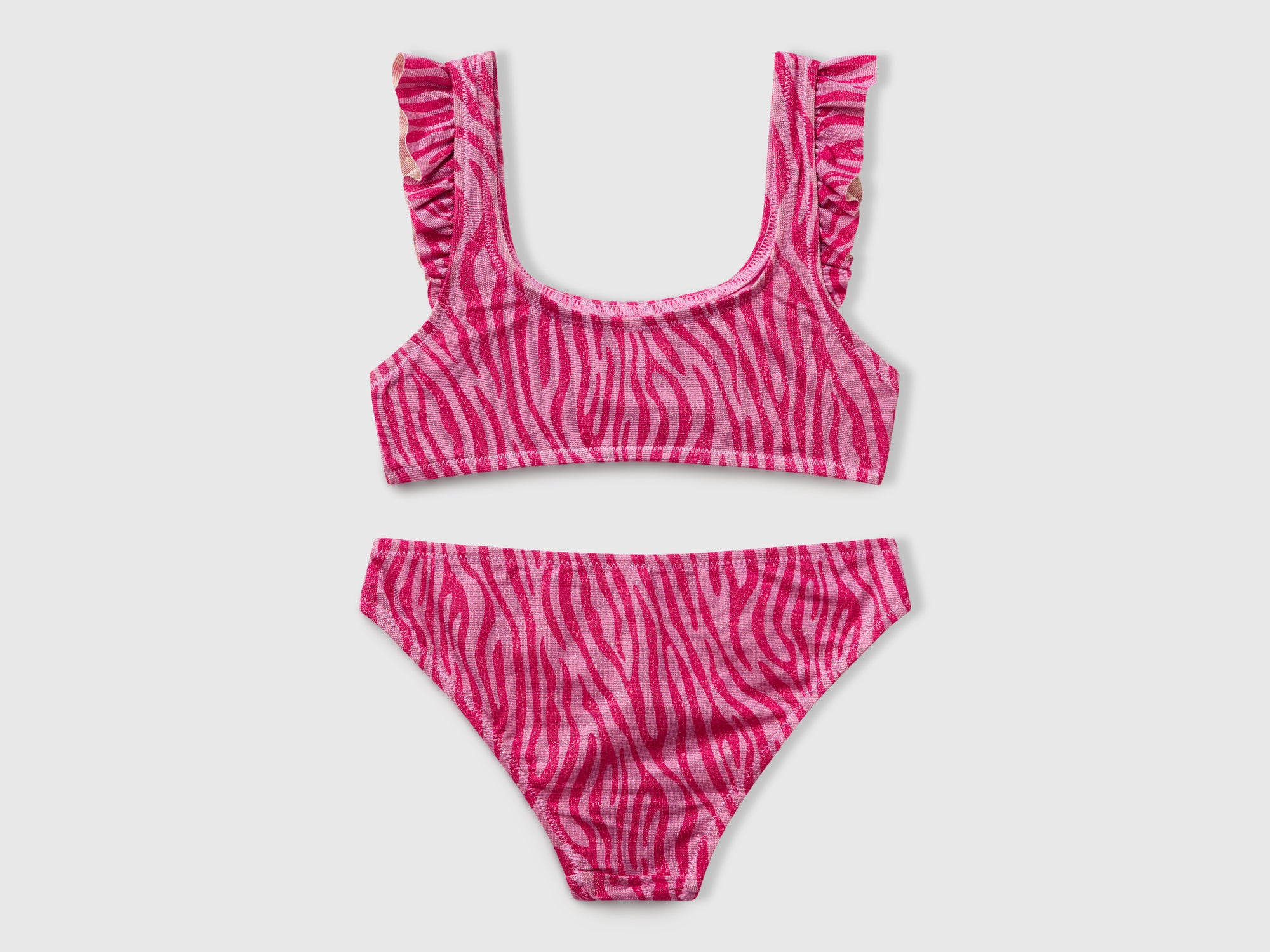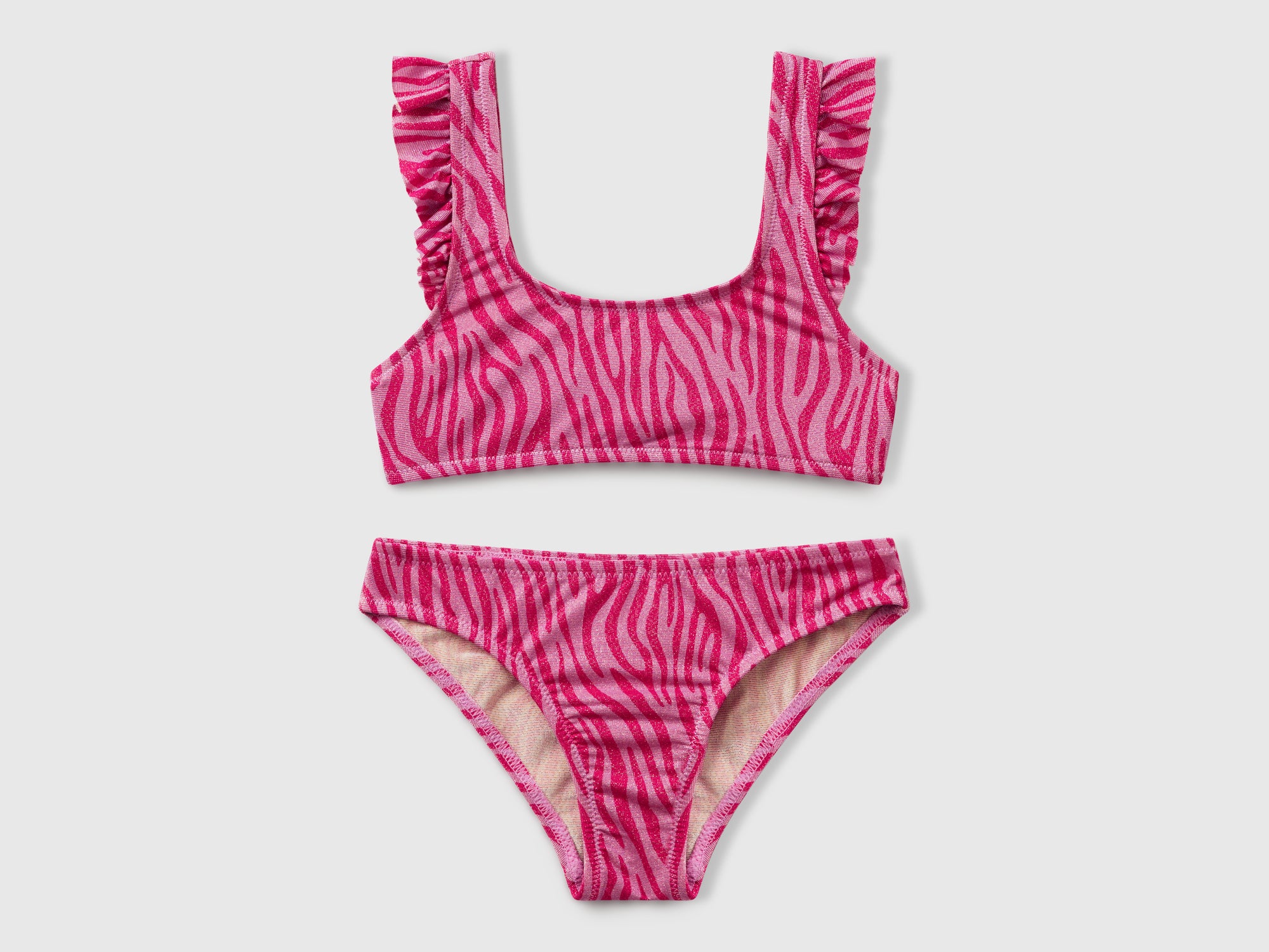 Costume bikini con stampa animalier e lurex. Top brassiere con rouches sulle spalline. Slip mare con fianco regolare.