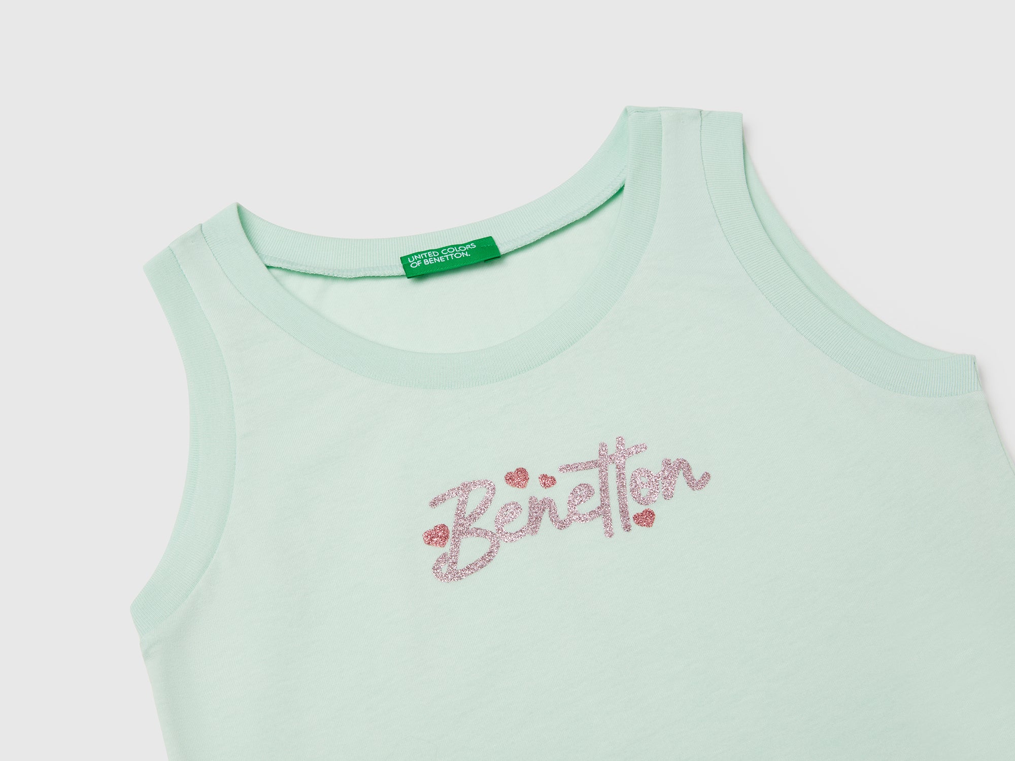 Top smanicato con scollo rotondo in puro cotone biologico. Spallina larga e stampa logo glitterata sul davanti. Look sportivo con un twist femminile. Articolo realizzato con tessuto contenente almeno il 95% di cotone biologico.