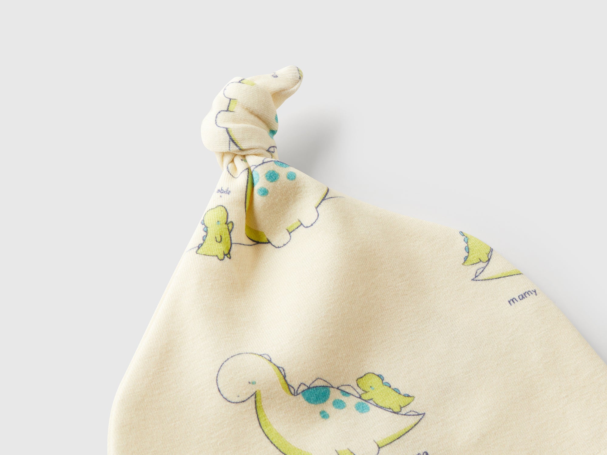 Cuffietta in morbido tessuto di cotone elasticizzato. Tenera stampa fantasia su tutto il capo e nodino decorativo. Per rendere il suo look ancora più divertente.