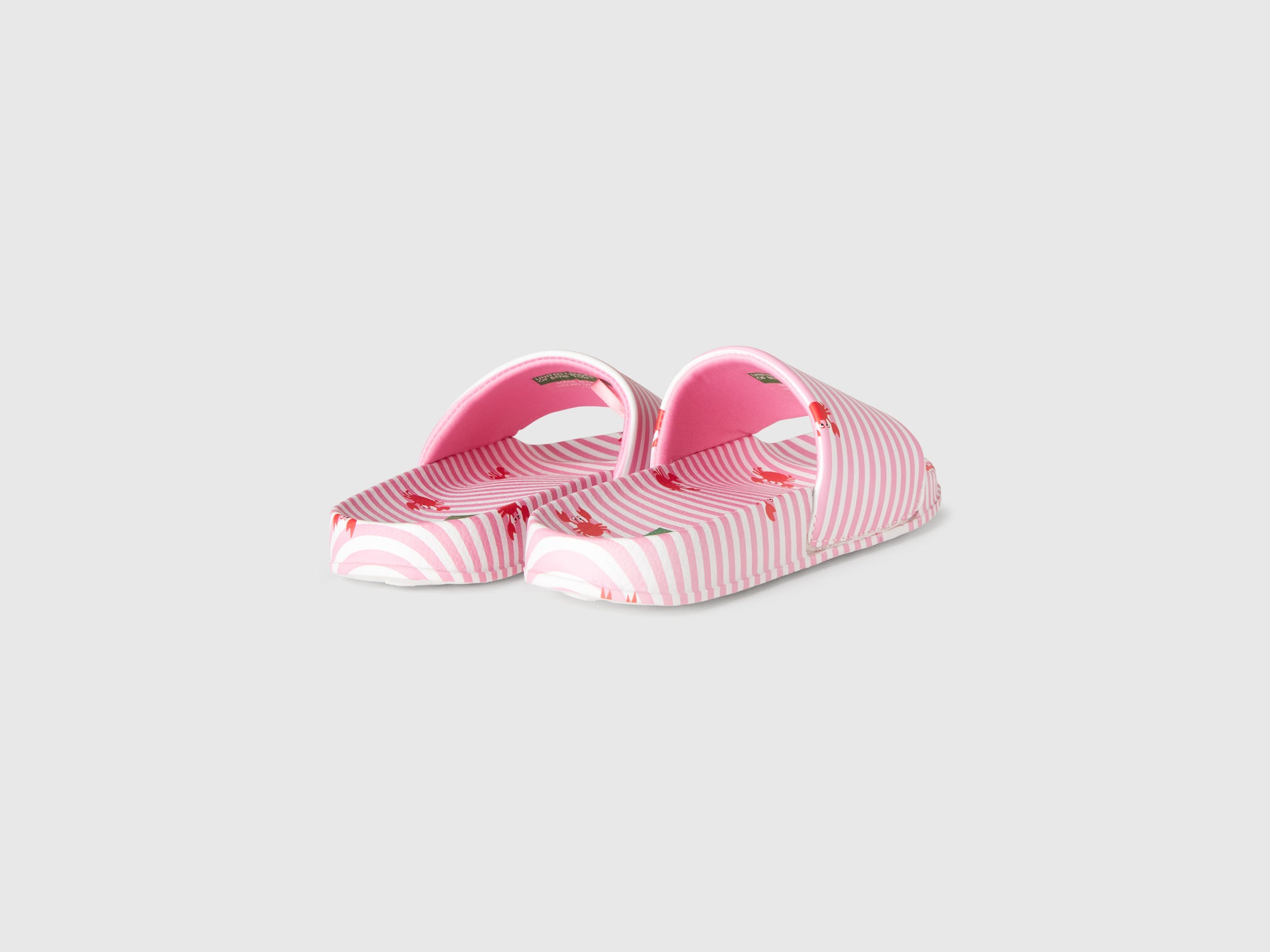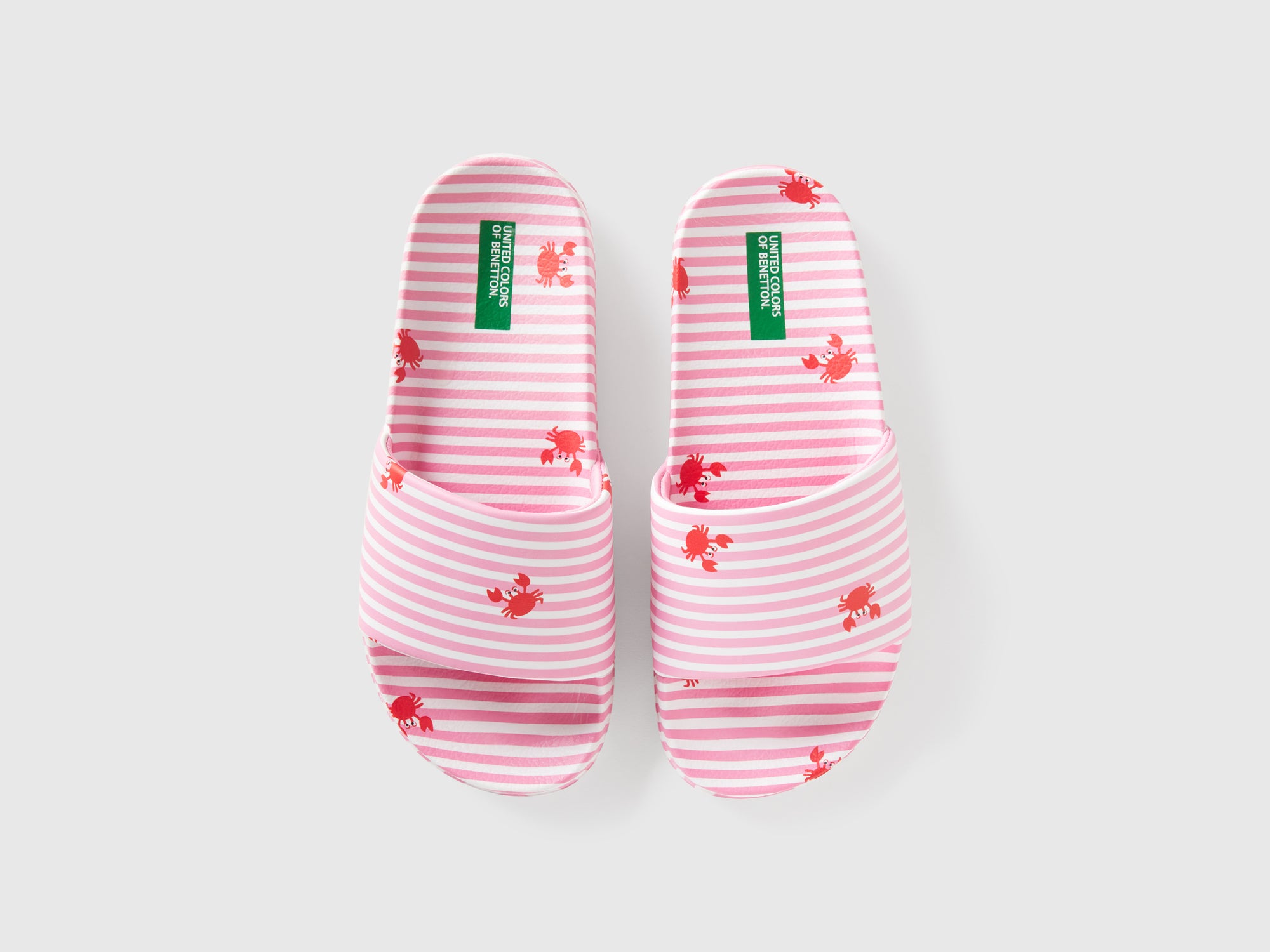 Ciabatte aperte con tomaia a fascia in tessuto spalmato. Suola in gomma EVA, leggerissima, resistente e lavabile. Colorata fantasia a righe bicolor con stampa granchi, per dire addio alla noia.