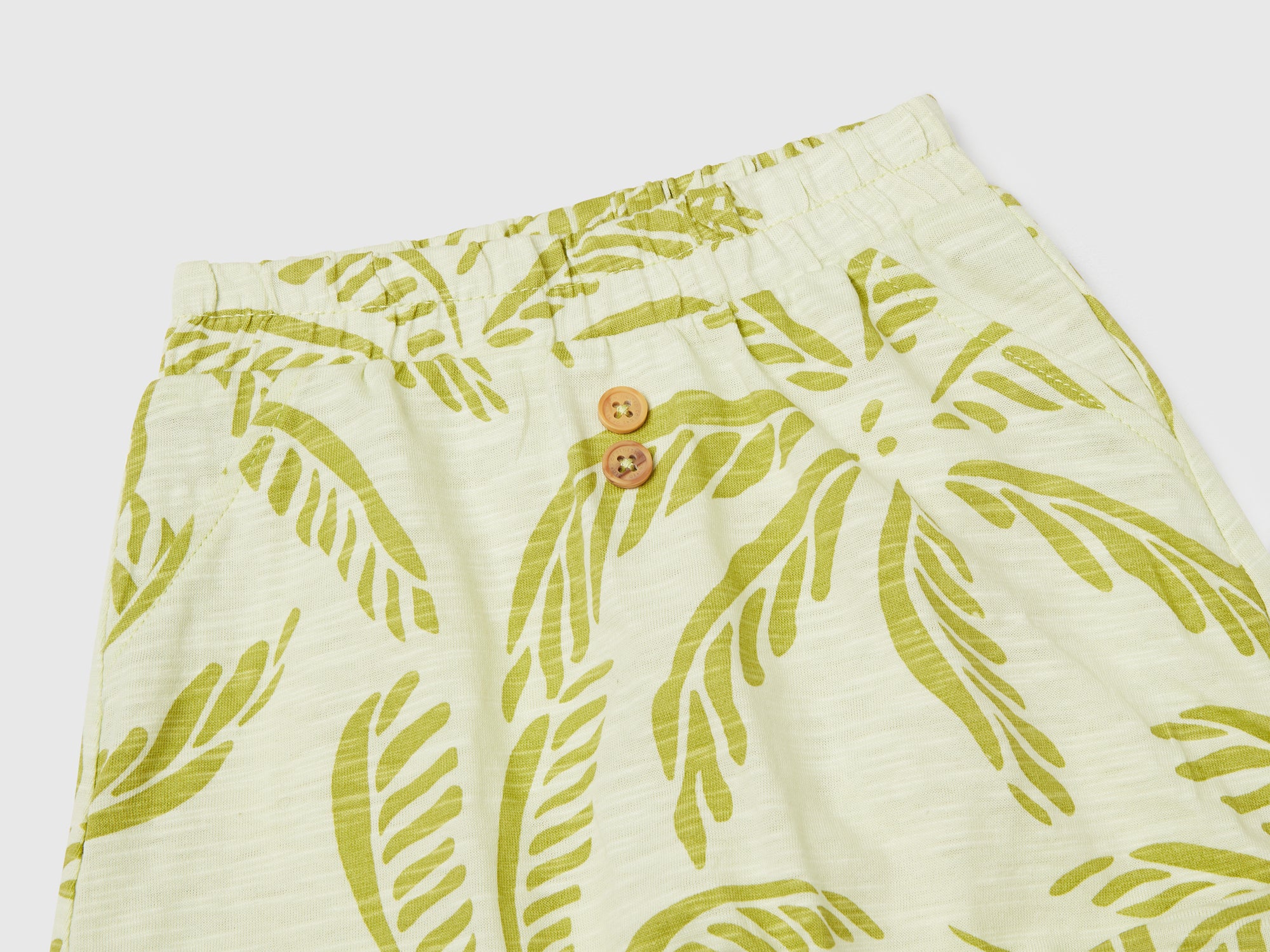 Tenero completo in tessuto leggero di puro cotone. Maglietta girocollo con manica corta a kimono e stampa davanti e dietro. Apertura sulla spalla con bottoni a pressione. Pantaloni corti con elastico interno in vita e stampa tropicale su tutto il capo. Facile da scegliere e da indossare.
