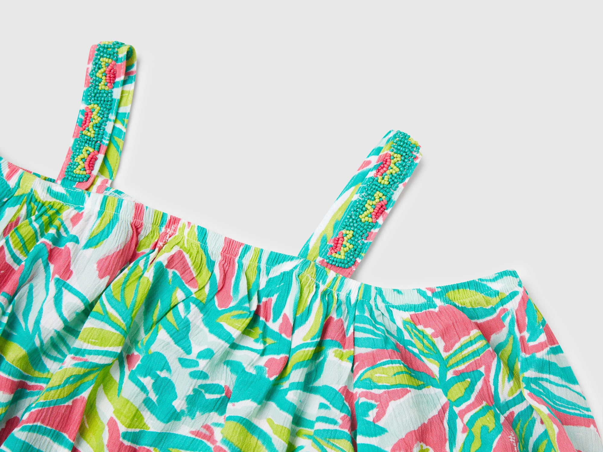 Top corto in tessuto crêpe di pura viscosa con stampa tropicale. Manica corta e spalline con dettaglio di perline colorate. Elastico interno su scollo e fondo. Colorato e femminile, per look dinamici.