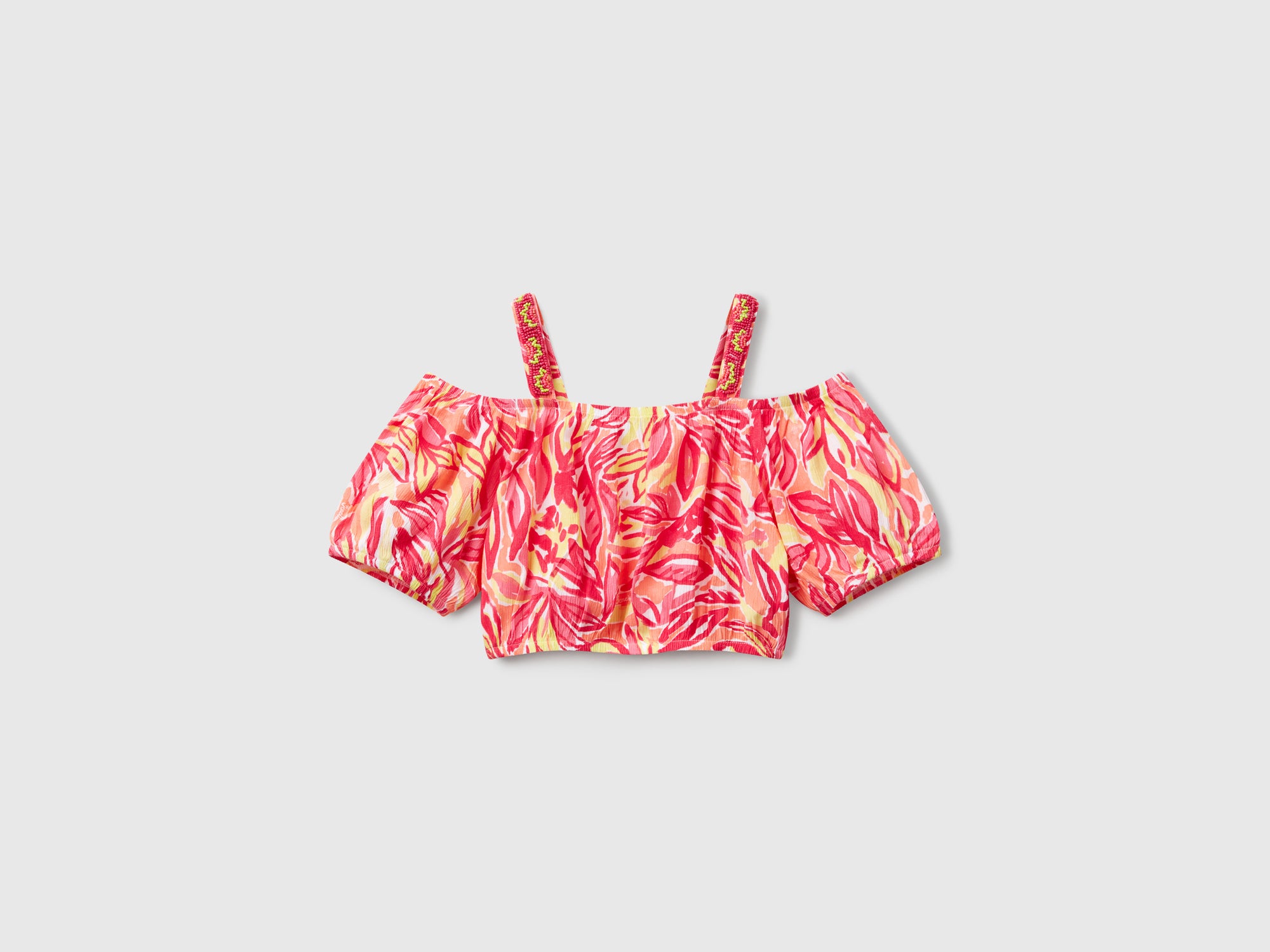 Top corto in tessuto crêpe di pura viscosa con stampa tropicale. Manica corta e spalline con dettaglio di perline colorate. Elastico interno su scollo e fondo. Colorato e femminile, per look dinamici.