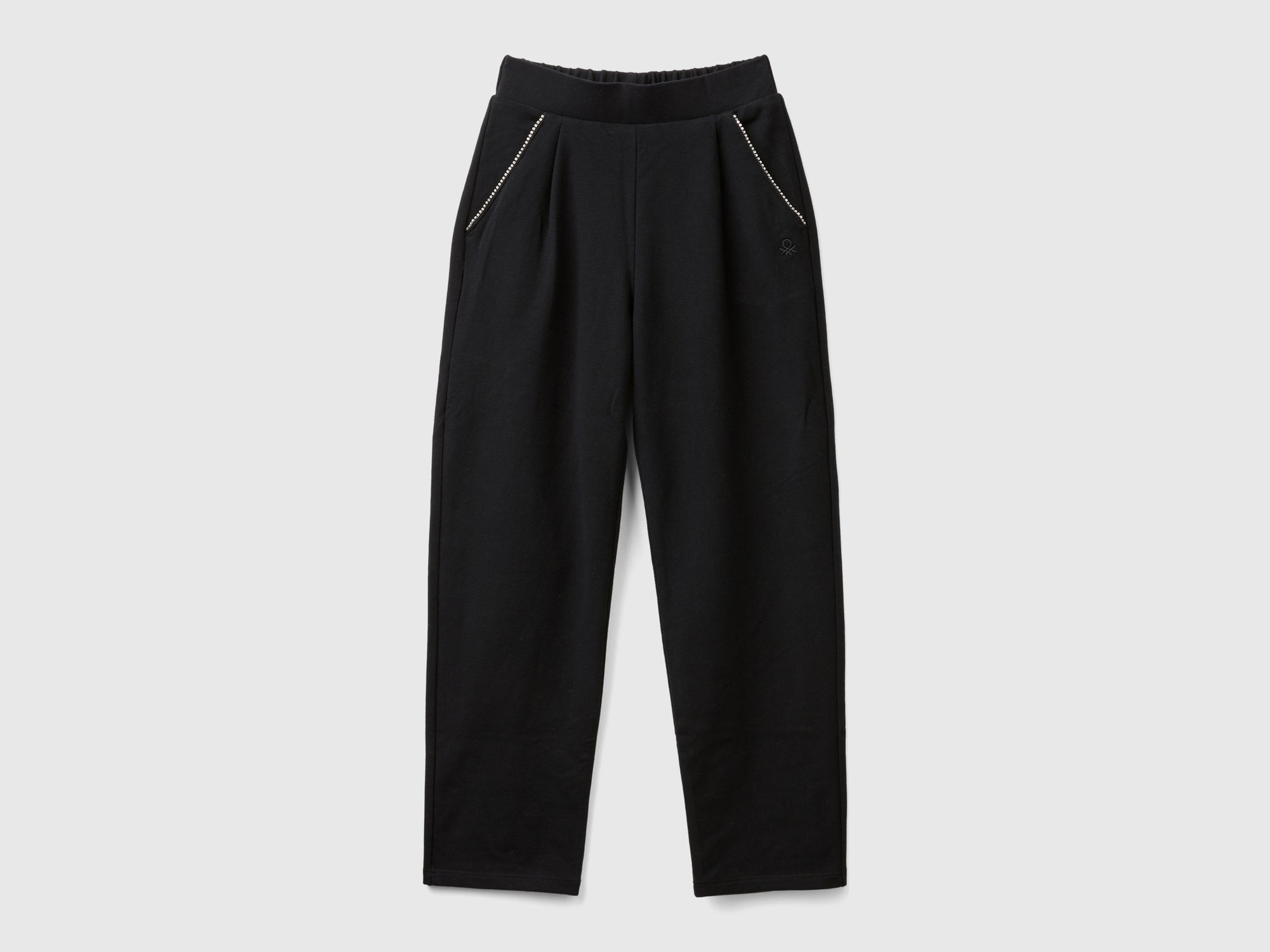 Pantaloni lunghi in felpa di cotone elasticizzato. Vita con elastico interno sul retro e applicazione effetto gioiello lungo le tasche davanti. Per outfit quotidiani con un tocco glamour.