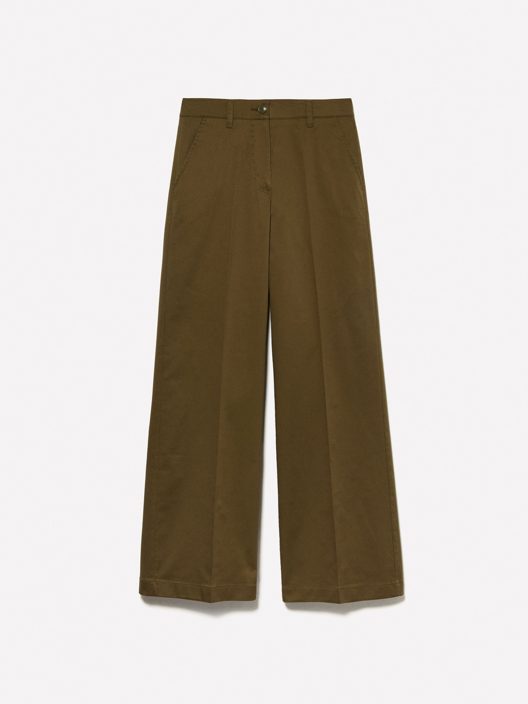 Pantaloni verde militare in twill di cotone elasticizzato. Piega stirata lungo la gamba, chiusura a zip e bottone, due tasche alla francese davanti e due tasche a filetto dietro.