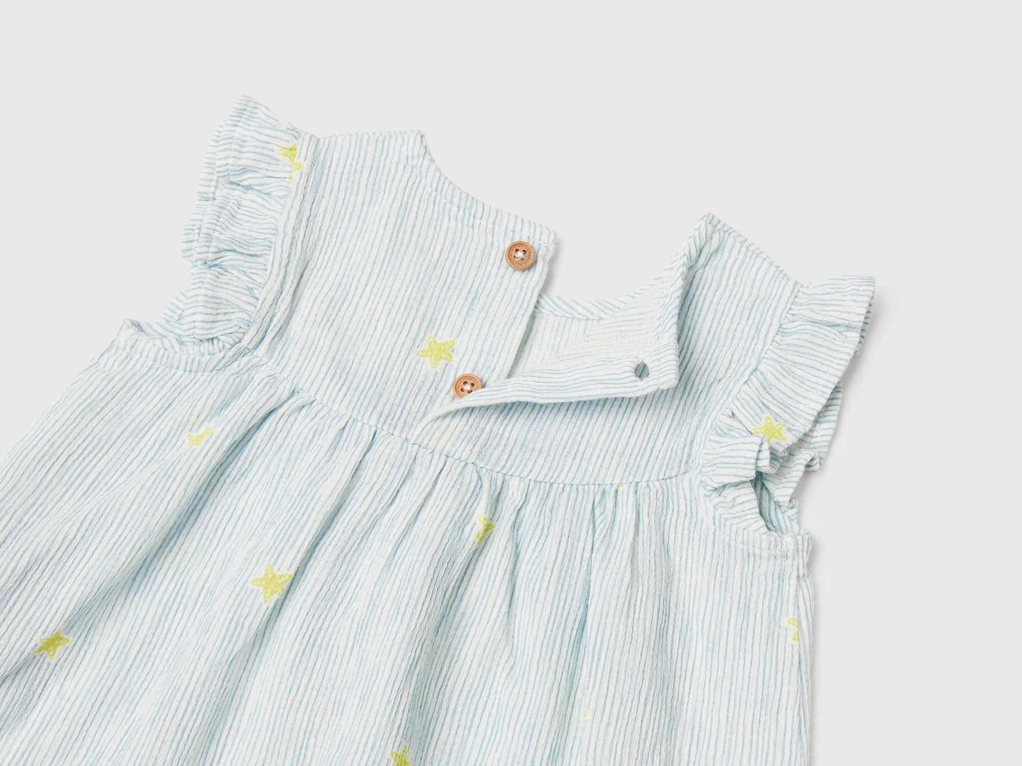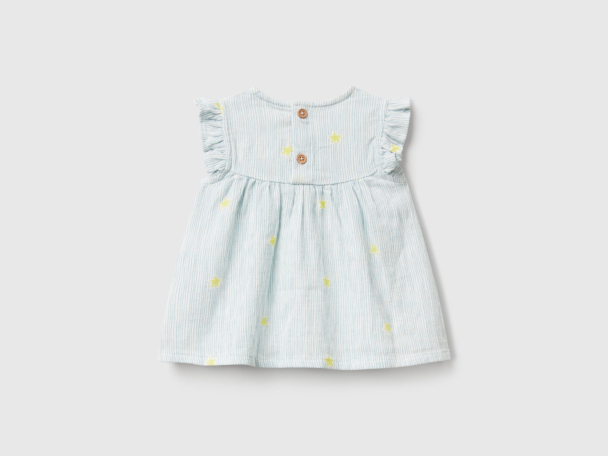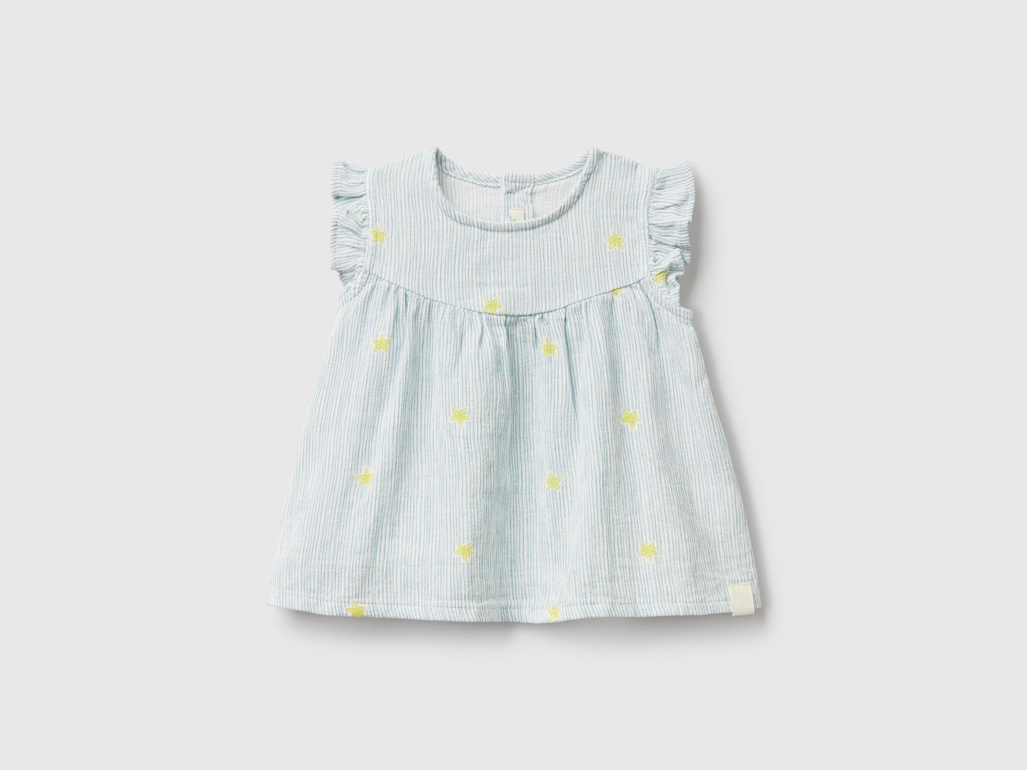 Tenera camicetta in tessuto leggero di puro cotone a righe con stampa stelline. Scollo rotondo con apertura parziale con bottoni sul retro e manica con rouches. Tenero e femminile, perfetto per la bella stagione.