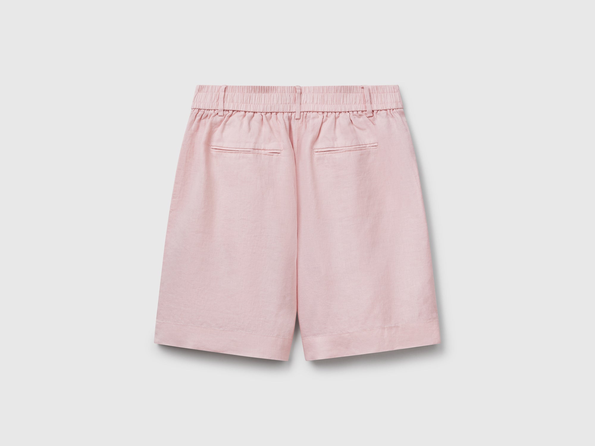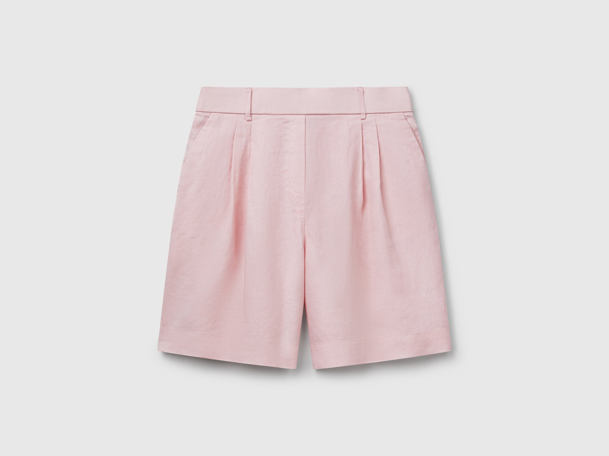 Pantaloni corti modello bermuda in puro lino. Gamba ampia con doppia pinces. Elastico in vita sul retro, comode tasche frontali e taschini a filetto sul retro. Freschi e confortevoli. Articolo realizzato con materiale in 100% lino coltivato in Europa.