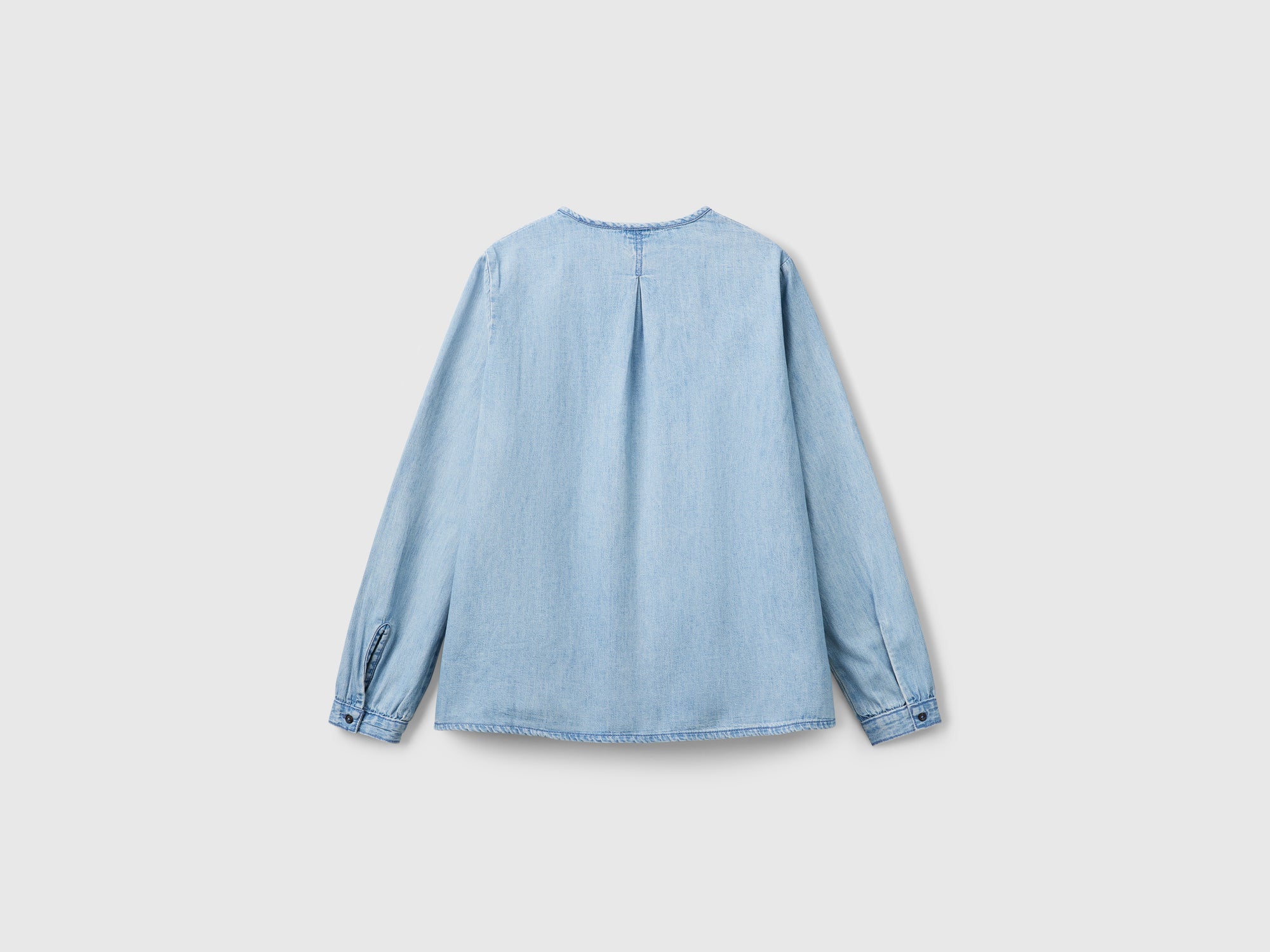 Camicetta a manica lunga in denim di puro cotone. Taglio svasato con scollo a V e faldone sul davanti. Versatile e femminile.