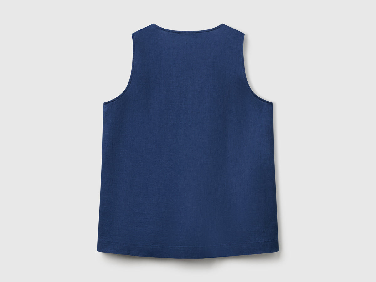 Camicetta leggera senza manica dal taglio svasato. Lunghezza al bacino con vestibilità morbida, scollo a V e faldone sul davanti. Articolo realizzato con materiale in 100% lino coltivato in Europa.