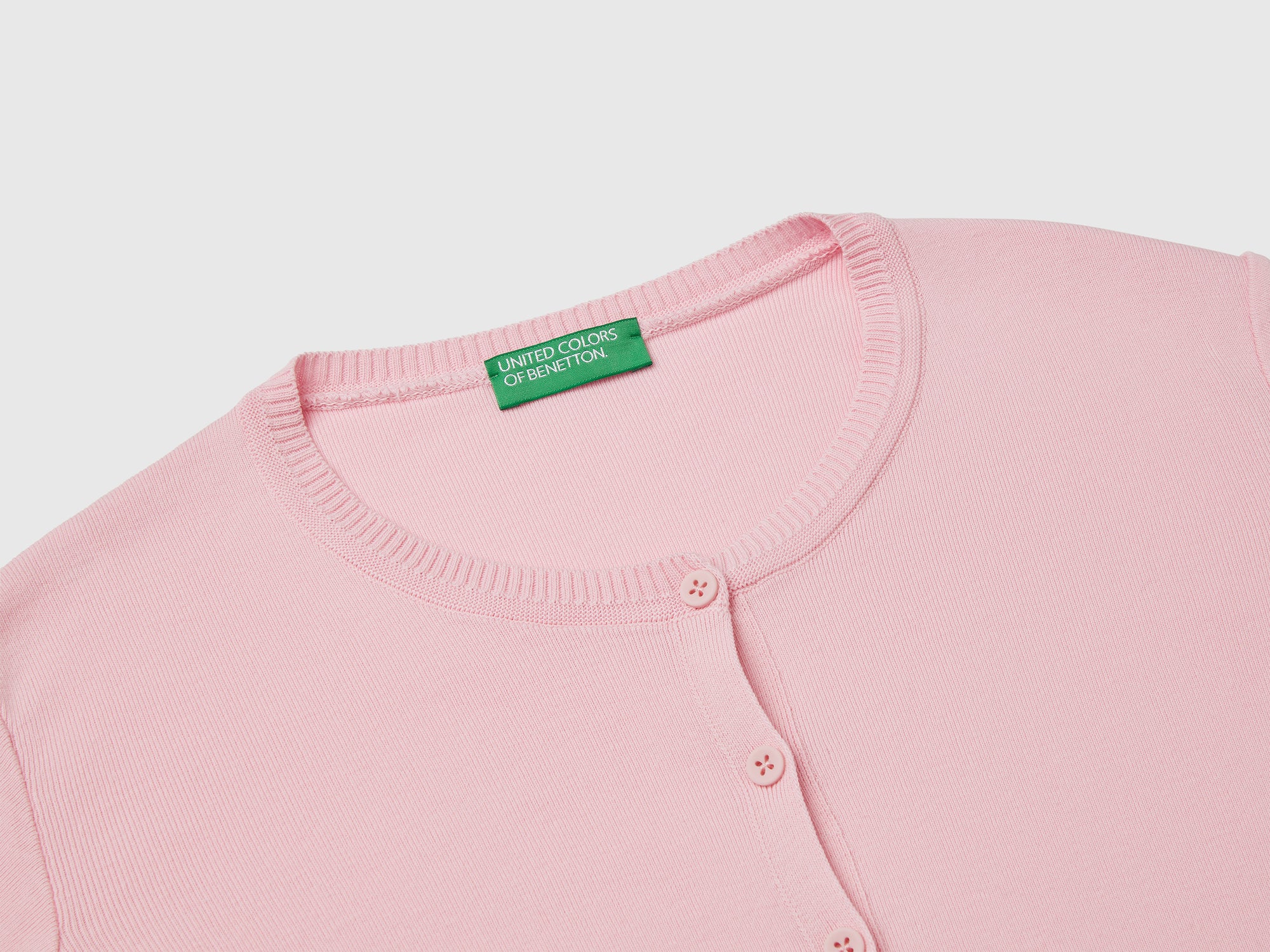 Morbida maglia girocollo a manica lunga in 100% cotone a costine con apertura frontale a bottoni. Un must-have del guardaroba femminile.