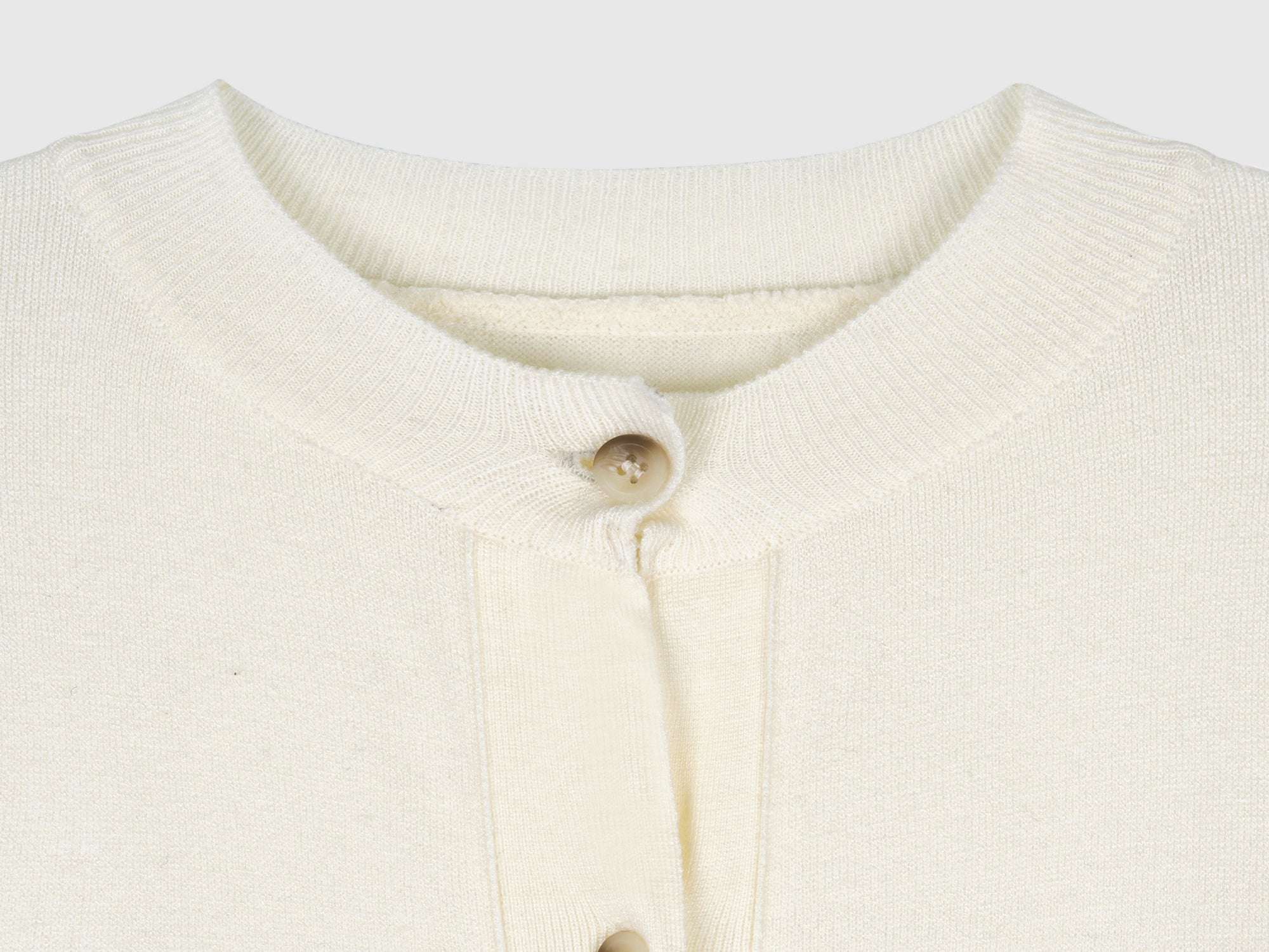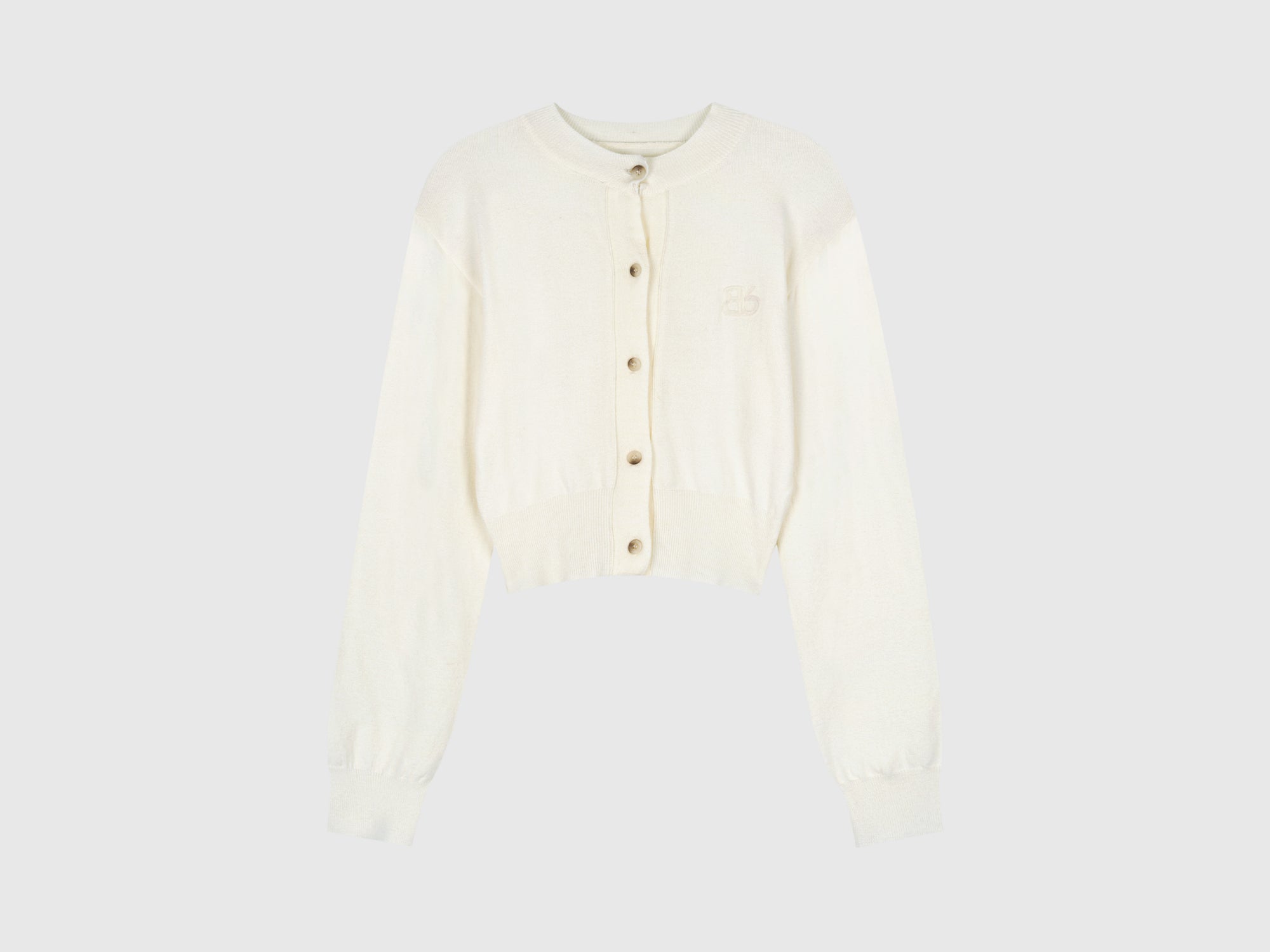 Cardigan girocollo in morbida maglia di misto viscosa. Manica lunga con spalla leggermente scesa, apertura frontale con bottoni e logo sul fondo a sinistra. Un capo versatile e piacevole sulla pelle, perfetto come strato extra.