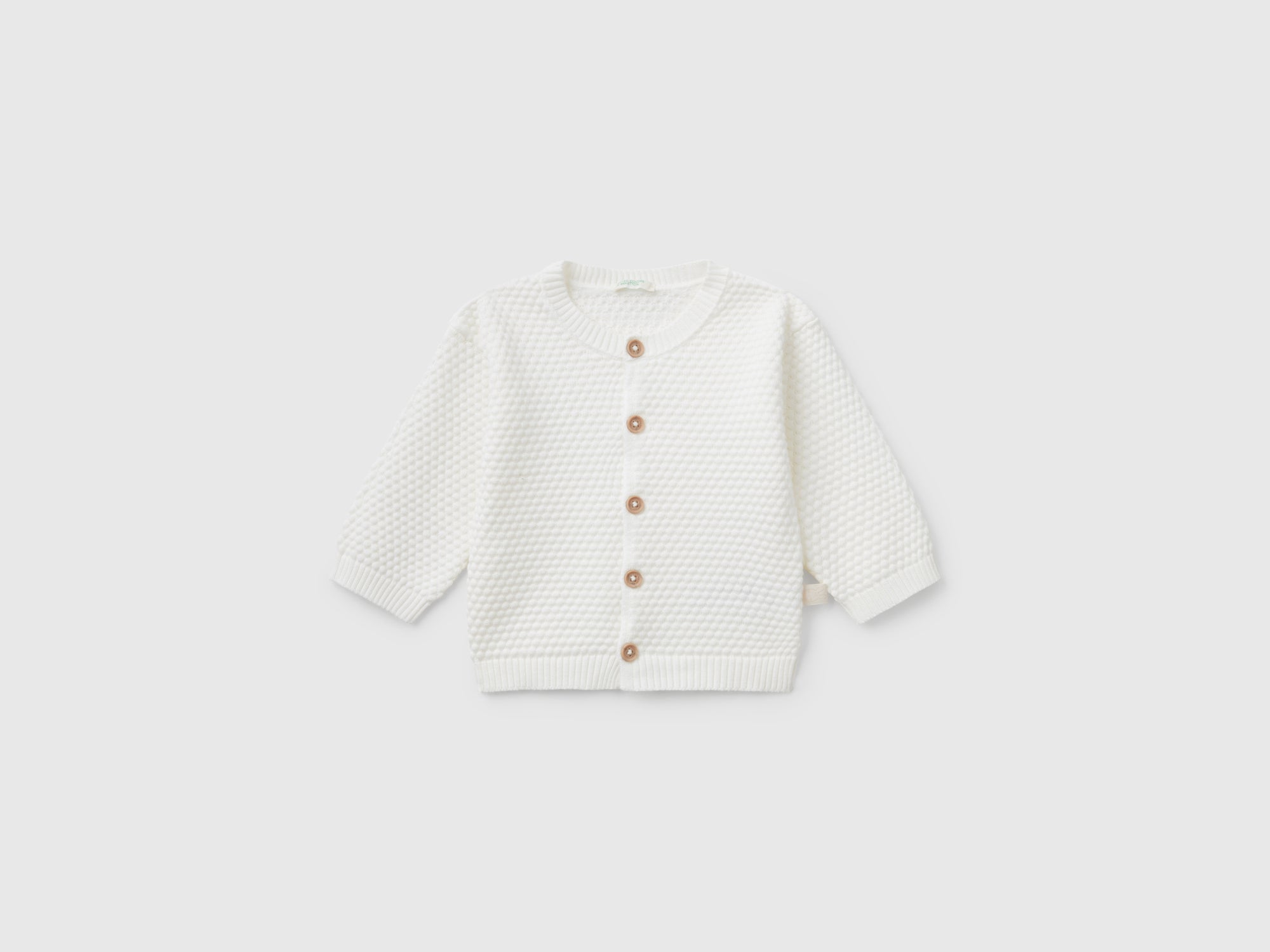 Cardigan girocollo in morbido tessuto di puro cotone. Particolare lavorazione con gioco di punti. Manica lunga, spalla scesa e comoda apertura frontale con bottoni effetto legno. Un capo "Easy Care" che può essere lavato direttamente in lavatrice.