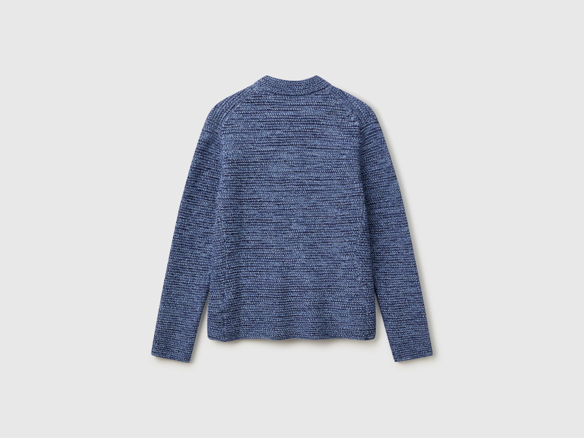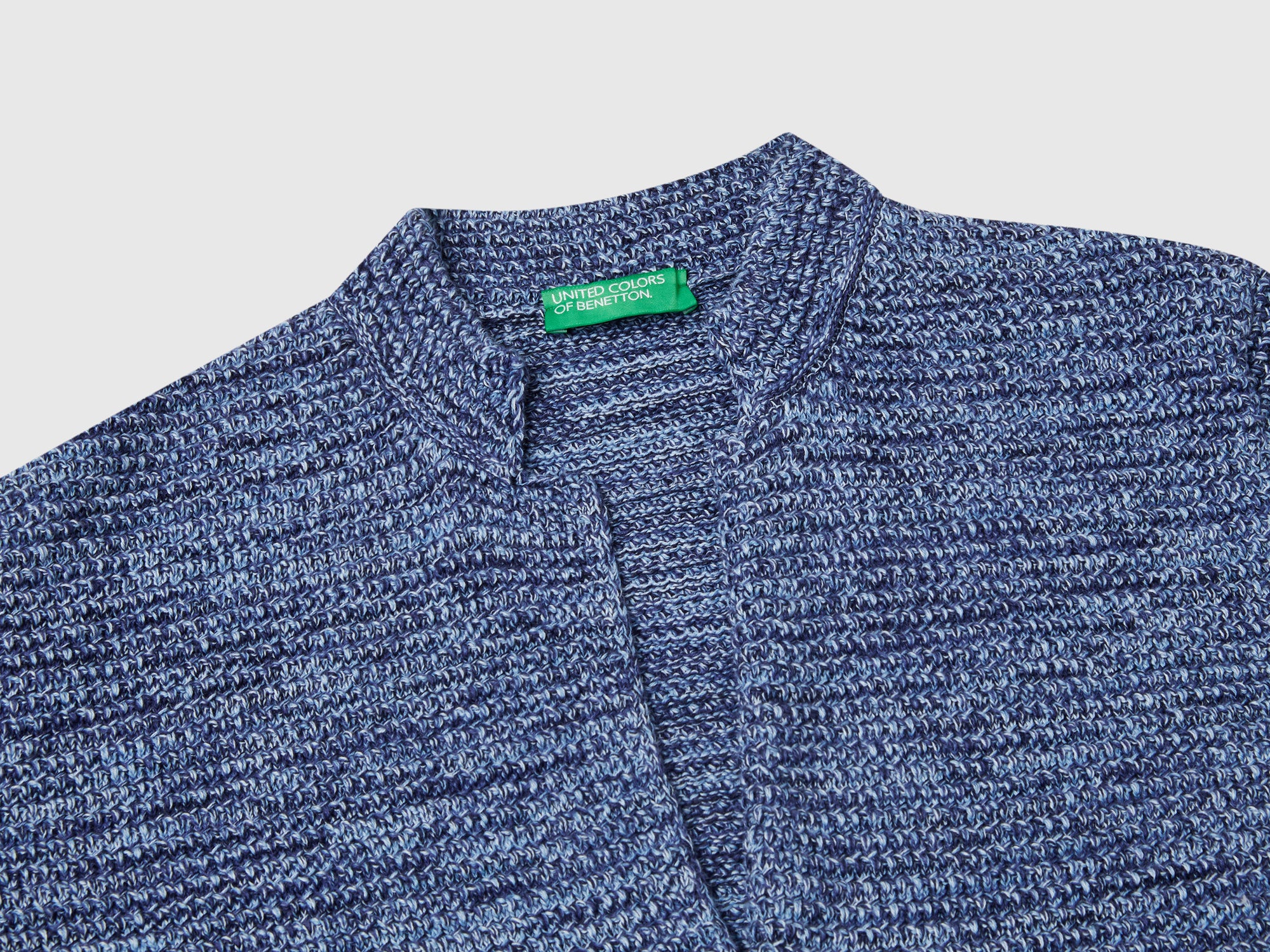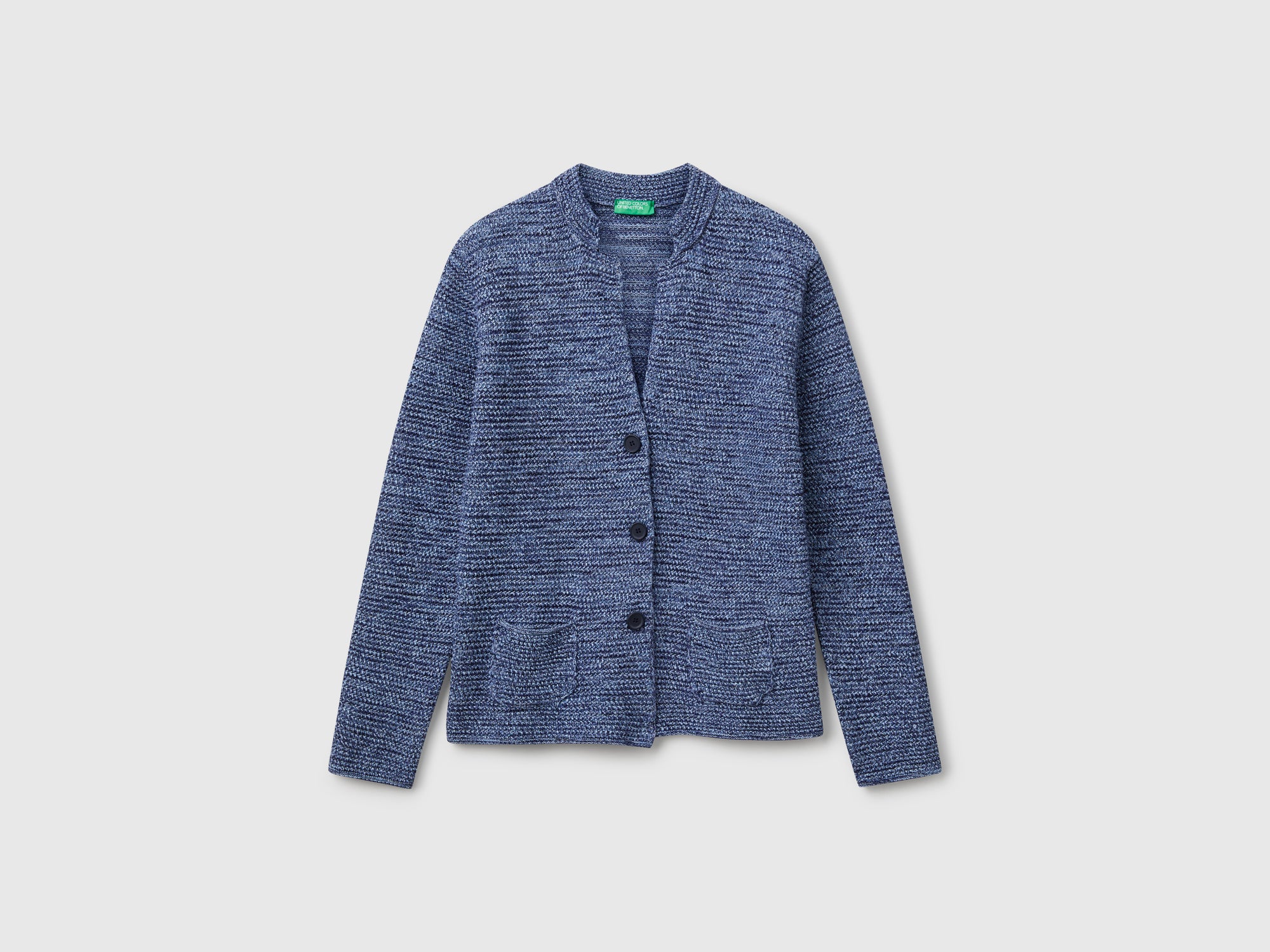 Giacchina in maglia di 100% cotone con particolare lavorazione con gioco di punti. Collo a fascetta, apertura frontale con bottoni e tasche applicate davanti. Casual e versatile, unisce la morbidezza di un maglione alla funzionalità di un blazer.