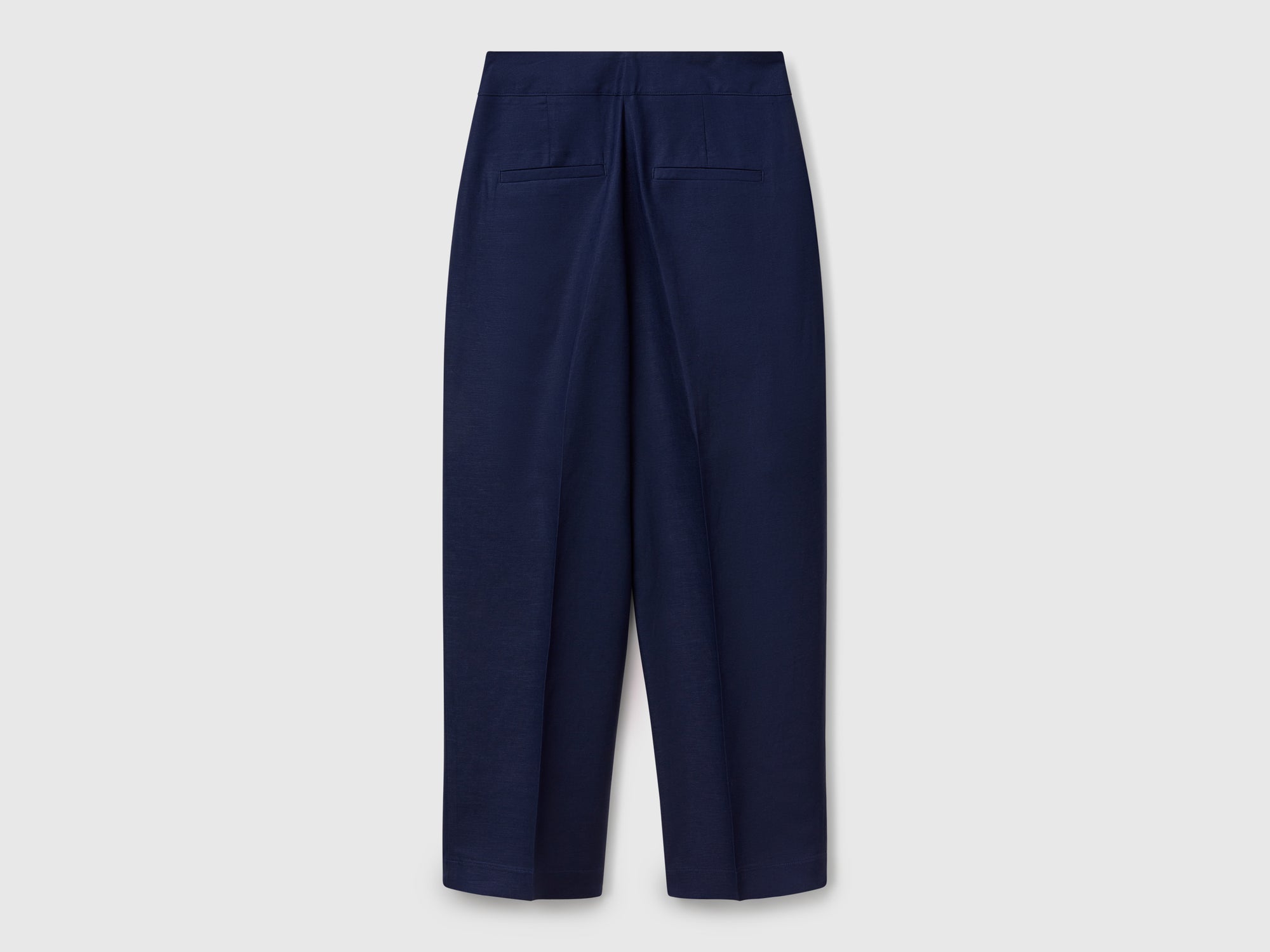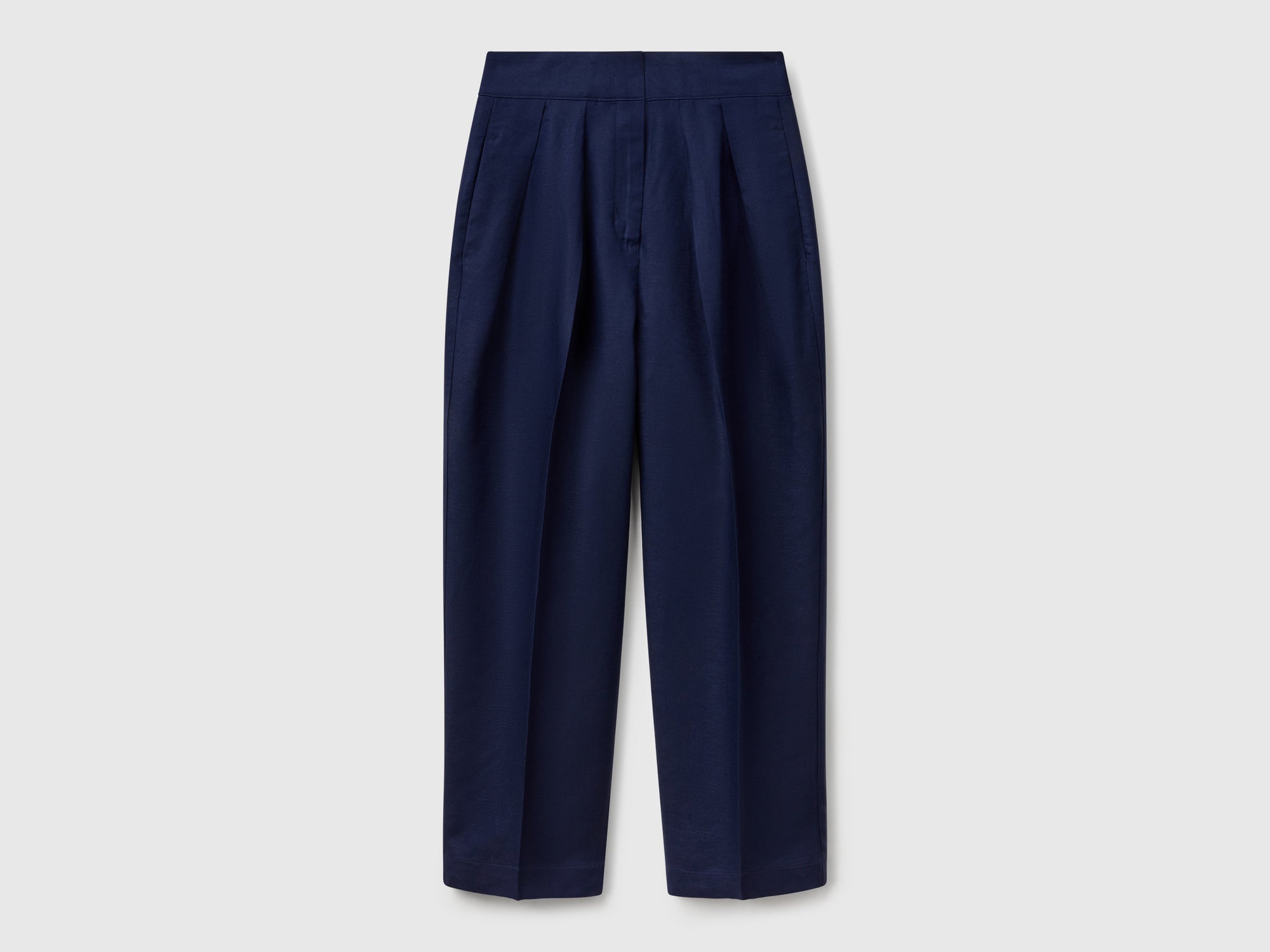 Long trousers in a soft, lightweight linen and lyocell blend. Loose-fitting legs with a pressed center pleat and darts. Concealed zip and button fastening, front pockets, and back welt pockets. A minimal and refined piece, always contemporary.