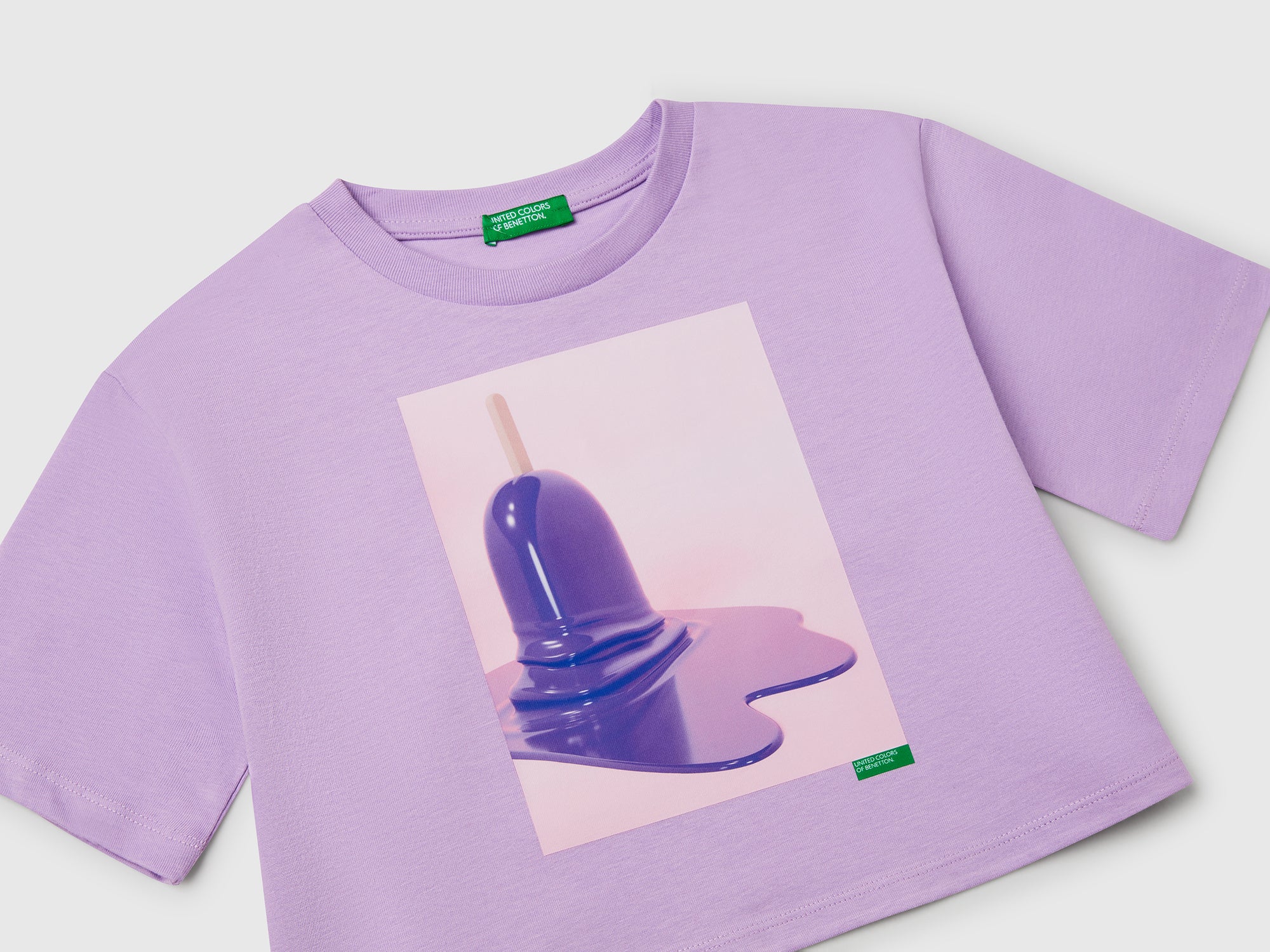 Maglietta girocollo in morbido tessuto di puro cotone. Vestibilità boxy e manica corta con spalla scesa. Colorata stampa gelati sul davanti, per un capo in stile pop art ispirato alla bella stagione.
