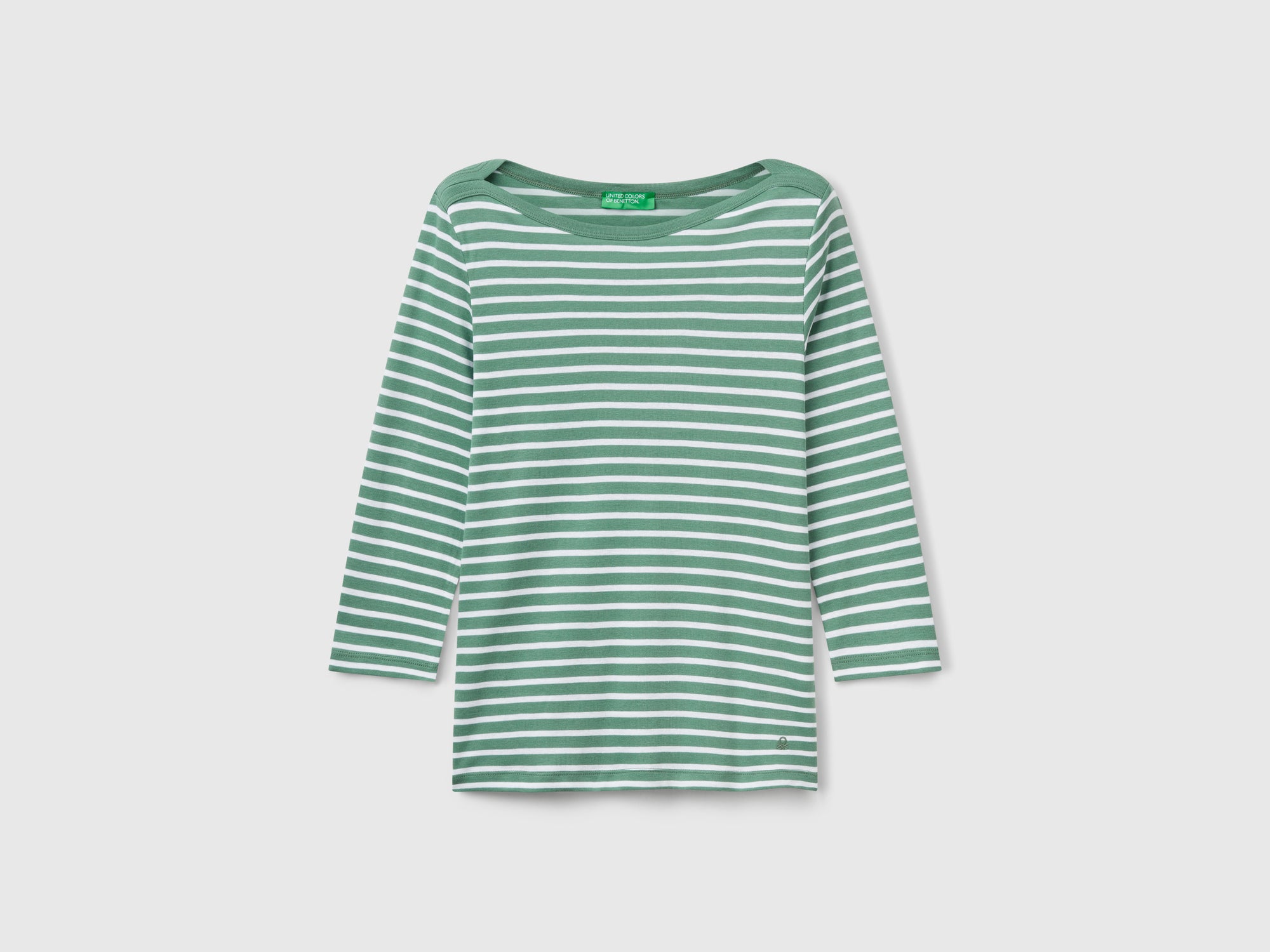Maglietta a costine con manica a 3/4 e scollo a barchetta. Vestibilità regolare e fantasia a righe tinto filo su tutto il capo. Logo ricamato sul fondo a sinistra. Casual e quotidiana, è realizzata in prestigioso cotone a fibra lunga, morbido e resistente.