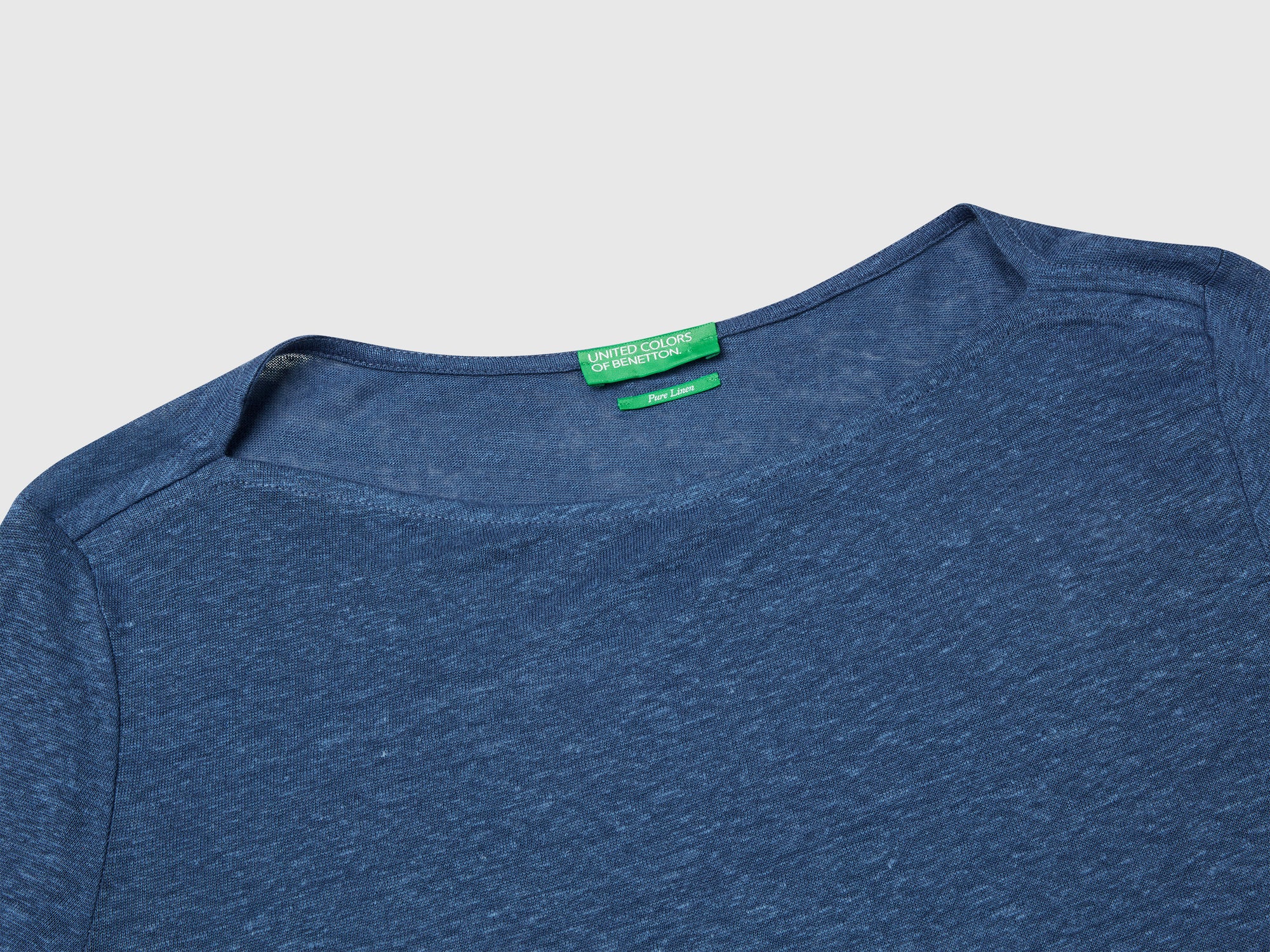 Maglietta in morbido tessuto di puro lino dalla vestibilità regolare. Scollo a barchetta, manica a 3/4 e spacchetti laterali. Fresca e quotidiana, per infiniti abbinamenti.