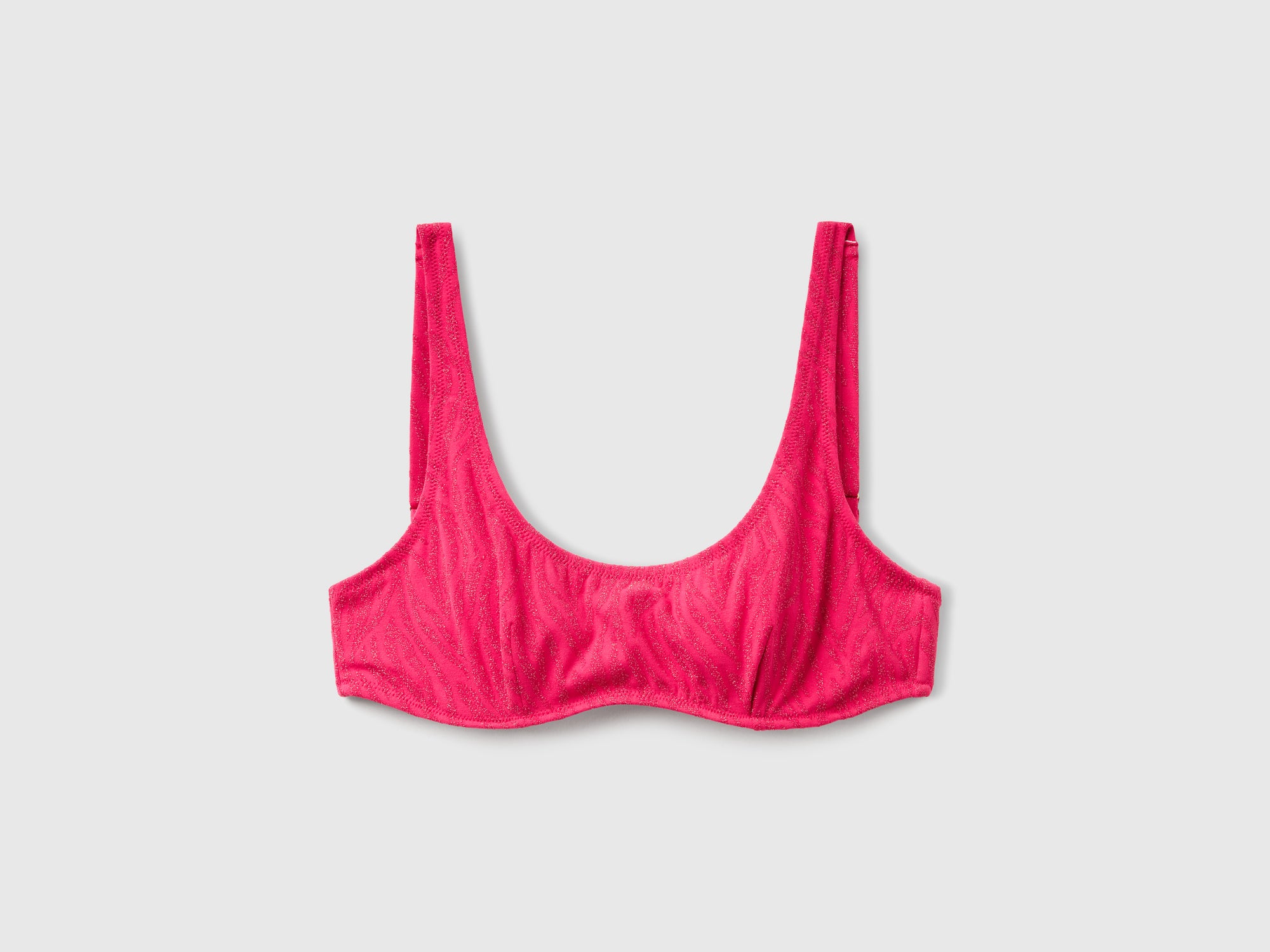 Reggiseno brassiere costume in tessuto elasticizzato con trama jacquard animalier e lurex. Coppa C con ferretto, spalline regolabili e fiocco da annodare sulla schiena.