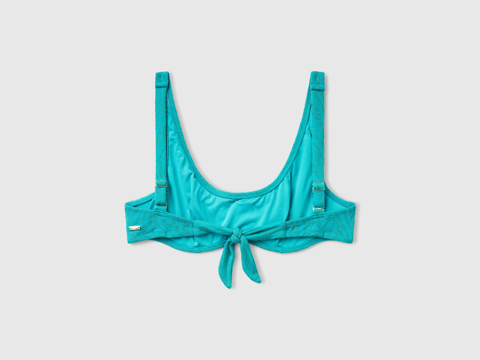 Reggiseno brassiere costume in tessuto elasticizzato con trama jacquard animalier e lurex. Coppa C con ferretto, spalline regolabili e fiocco da annodare sulla schiena.