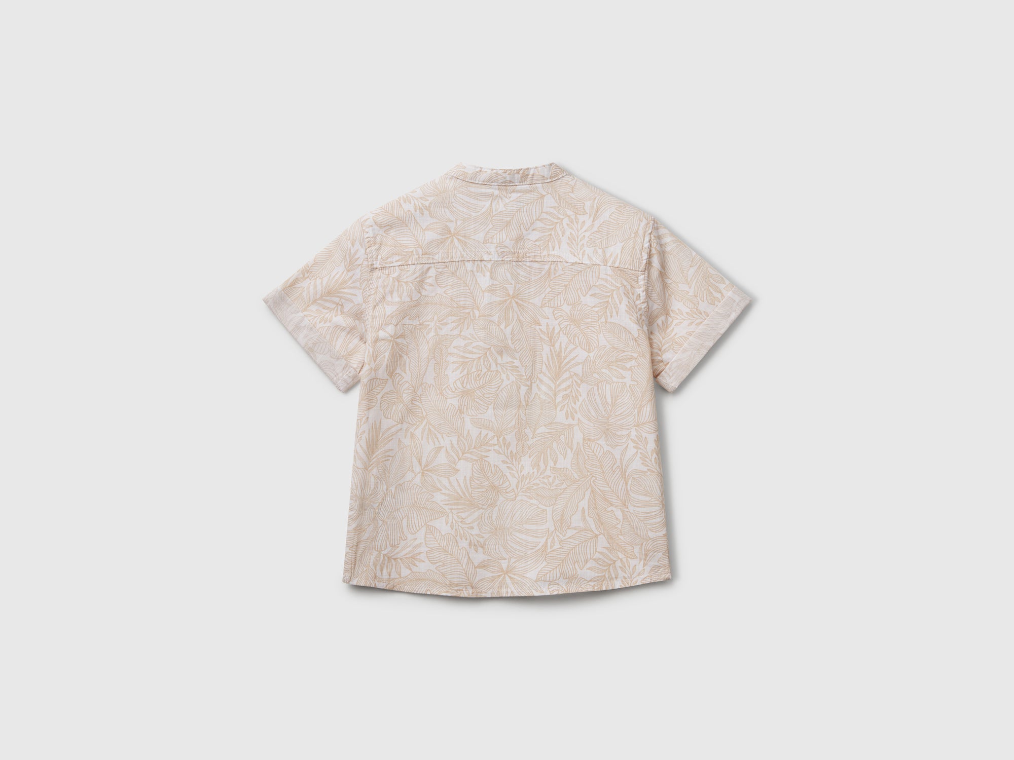 Camicia a manica corta in tessuto leggero di puro cotone. Colletto alla coreana, abbottonatura parziale sul davanti. Stampa tropicale su tutto il capo, per outfit dinamici e pieni di allegria.